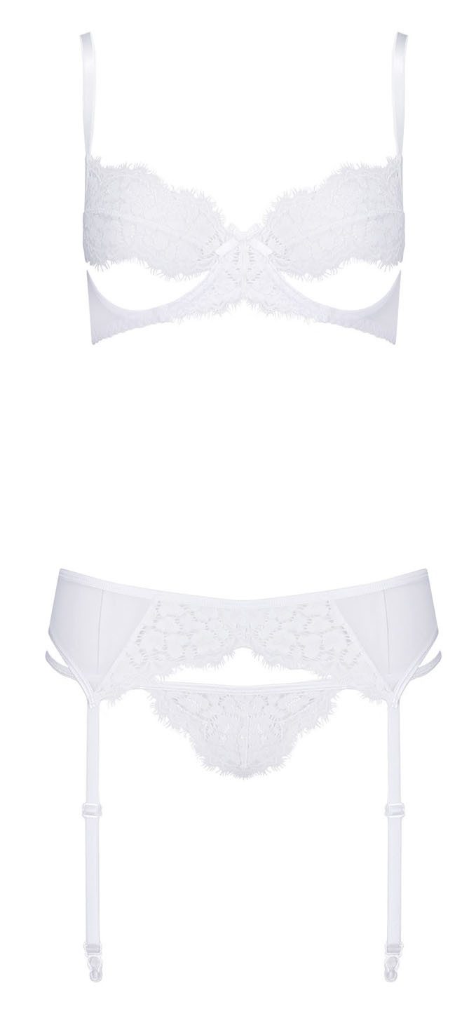 Dieses 3-teilige Dessous-Set besteht aus einem BH mit Bügeln, einem Strapsgürtel und dem passenden String