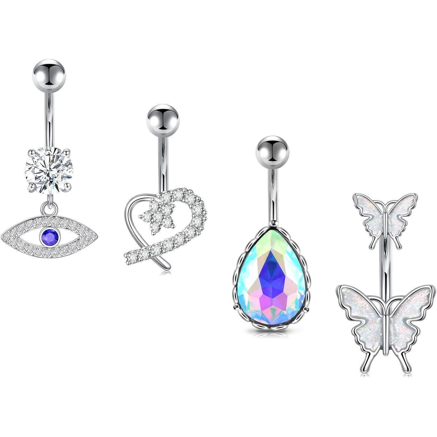 Das AVYRING Bauchnabelpiercing-Set bietet 4 Piercings in einem stilvollen Silberdesign mit Herzen und Schmetterlingen. Jedes Stück kommt mit einem kostenlosen Geschenk Samtbeutel, perfekt zum Aufbewahren oder Verschenken. Der Ball des Piercings kann leicht geschraubt werden, was das Anlegen und Entfernen erleichtert und gleichzeitig ein attraktives Erscheinungsbild bietet.