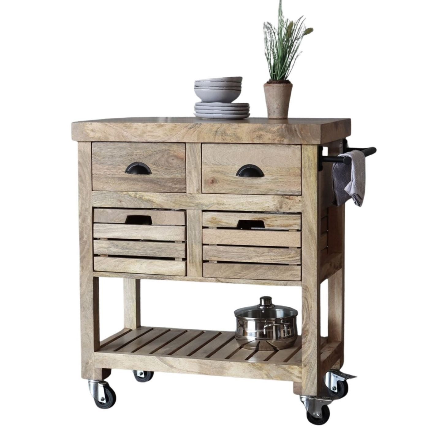 Ein perfekter und äußerst praktischer Helfer rund um Küche, Wohnzimmer und Garten. Rundum begehbar bietet der Küchenwagen dank seiner großen Schubladen und Holzkisten eine Menge zusätzlichen Stauraum. Die solide Verarbeitung aus massivem Mangoholz mit eingefasster Tischplatte verleiht ihm nicht nur einen hohen Nutzwert, sondern auch einen unverwechselbaren Charme im Vintage Design. Der Einsatzort für dieses Prachtstück ist sehr vielseitig. Eine ideale Erweiterung des Arbeitsbereiches in der Küche, als Servierwagen, als Konsolentisch oder im Garten.