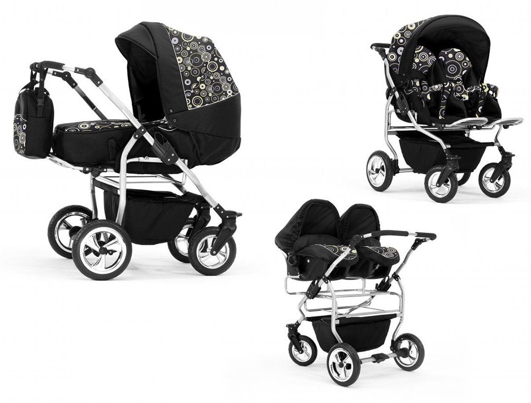 | Lieferumfang | Gestell mit Rädern Wanne mit integrierten Sportsitzen 2 x Softtragetaschen Beindecke Regenfolie Insektennetz großzügige Wickeltasche 2 x Autositze mit Zubehör Gestelladapter |