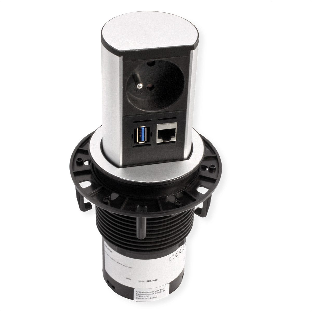 ELEVATOR Herausfahrbare Steckdoseneinheit, Aluprofil eloxiert, 1xUTE Steckdose Frankreich schwarz mit erhöhtem Berührungsschutz Zuleitung 0,5m H05VV-F3G1,5mm² mit GST18 Stecker schwarz, 1xUSB 3.0 A Buchse mit 3m Datenleitung inkl. USB 3.0 A Stecker, 1xCAT6A 90° mit 3m Datenleitung inkl. Stecker im Karton