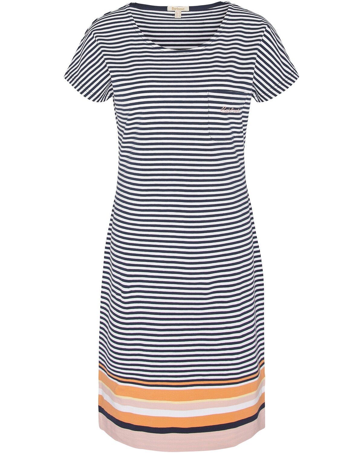 Das klassische Harewood-Kleid von Barbour versprüht mit seinem frischen Streifendesign maritimes Flair. Marine-Streifen auf weißem Grund harmonieren perfekt mit farbigen Blockstreifen im unteren Bereich, die das Kleid zu einem echten Hingucker machen. Ein weiter Rundhalsausschnitt verleiht dem Design eine elegante Note und rundet den Look geschmackvoll ab.