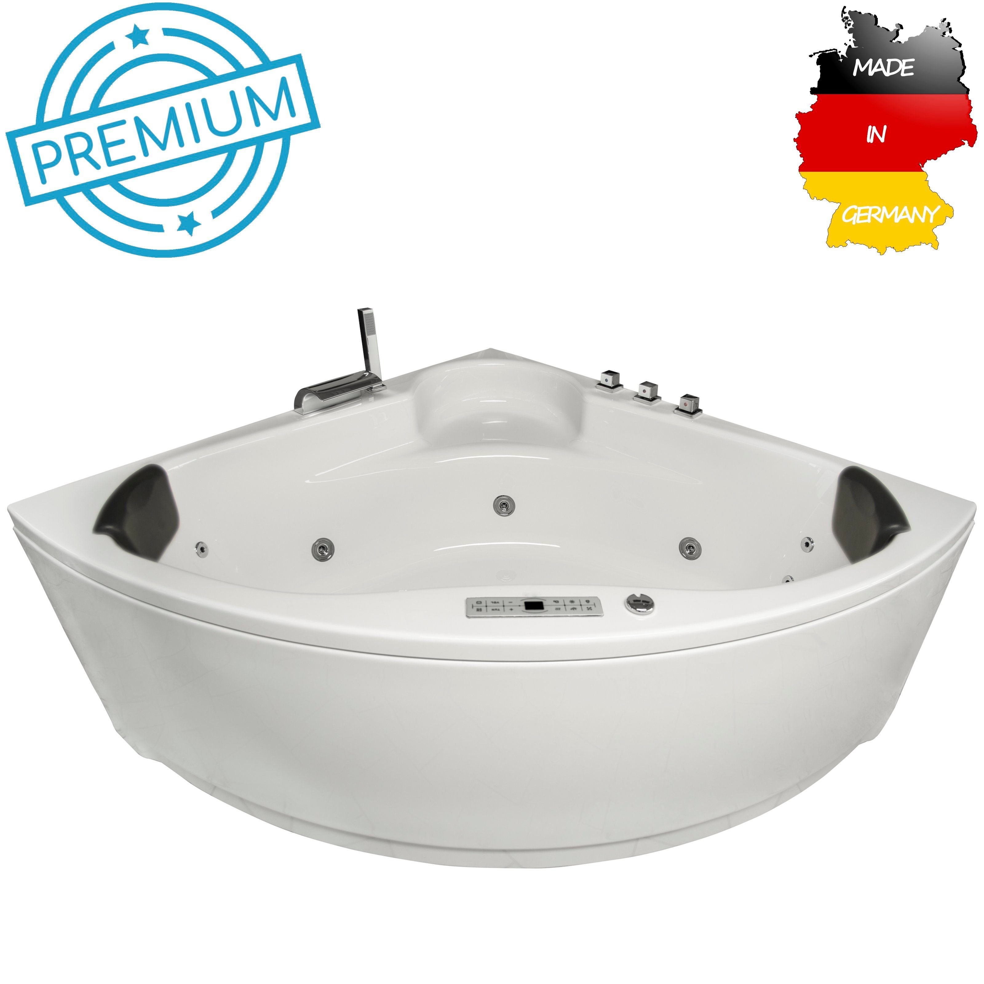 Dreieckige Raumsparwanne in Hochglanz-Weiß für 2 Personen mit gepolsterten Kopfstützen, bequeme Rückenschräge, Messing Armatur-Set in Chrom inkl. Wasserfall und 21 leistungsstarken Massagedüsen, welche sich in 5 ultraflache Seitendüsen, 8 Bodendüsen und 8 Rückendüsen aufteilen.