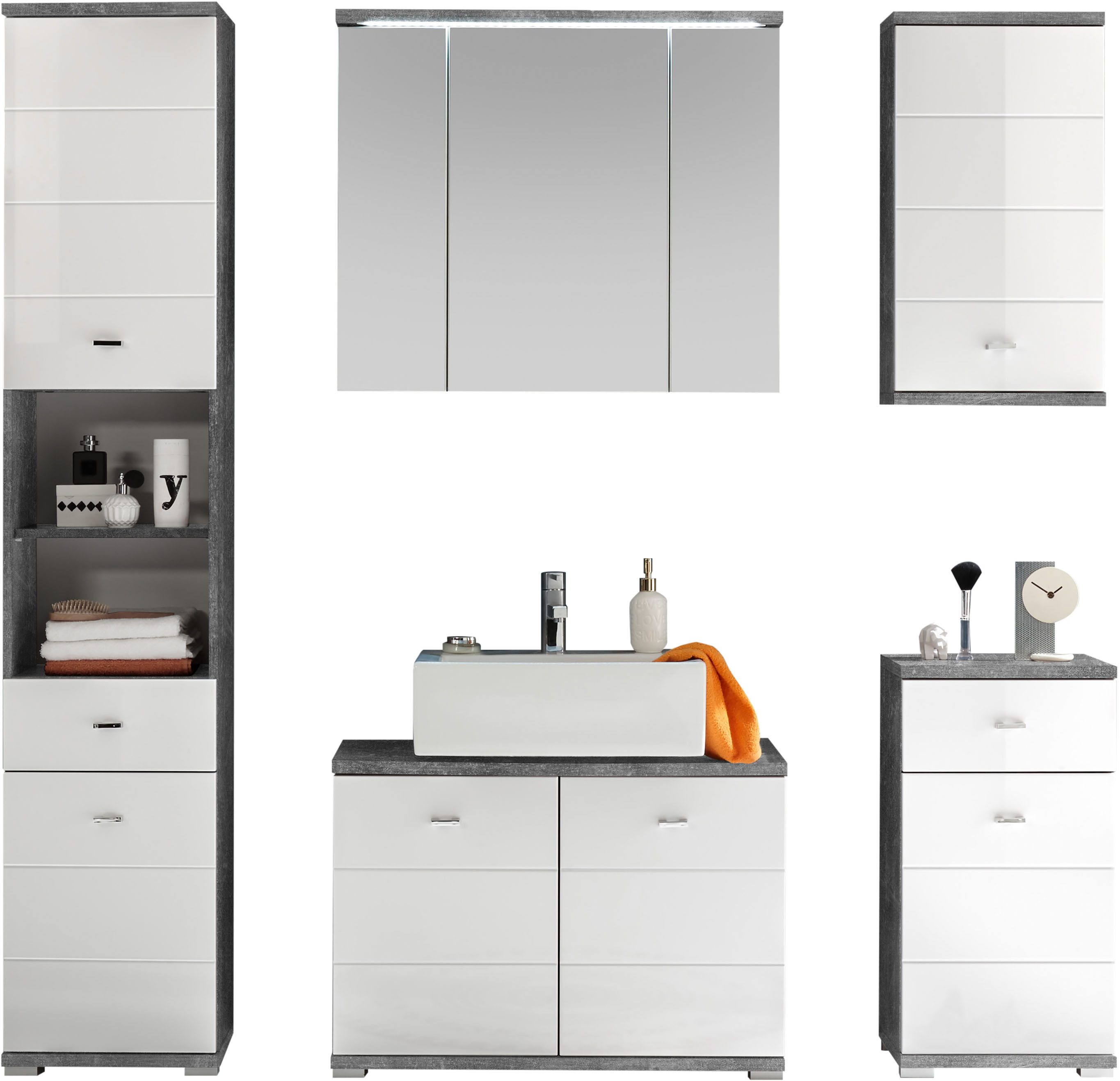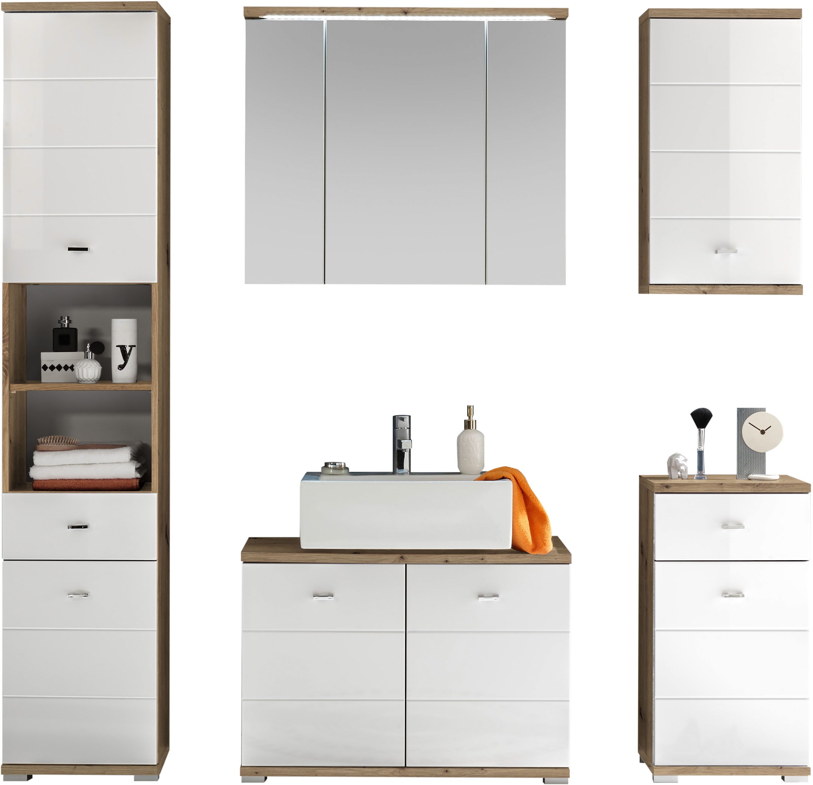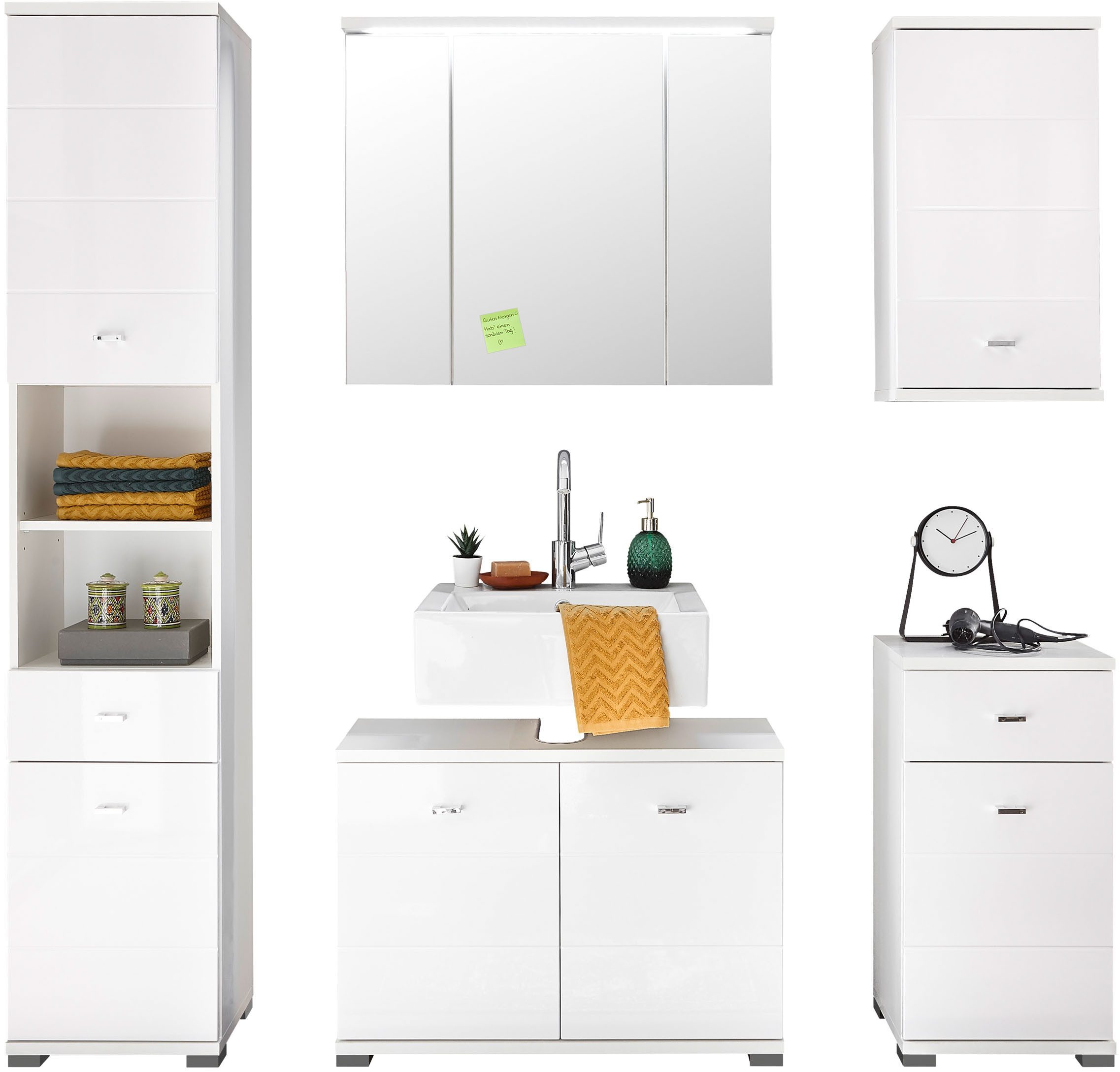 | Lieferumfang | Hochschrank, Waschbeckenunterschrank, Spiegelschrank, Hängeschrank, Kommode |