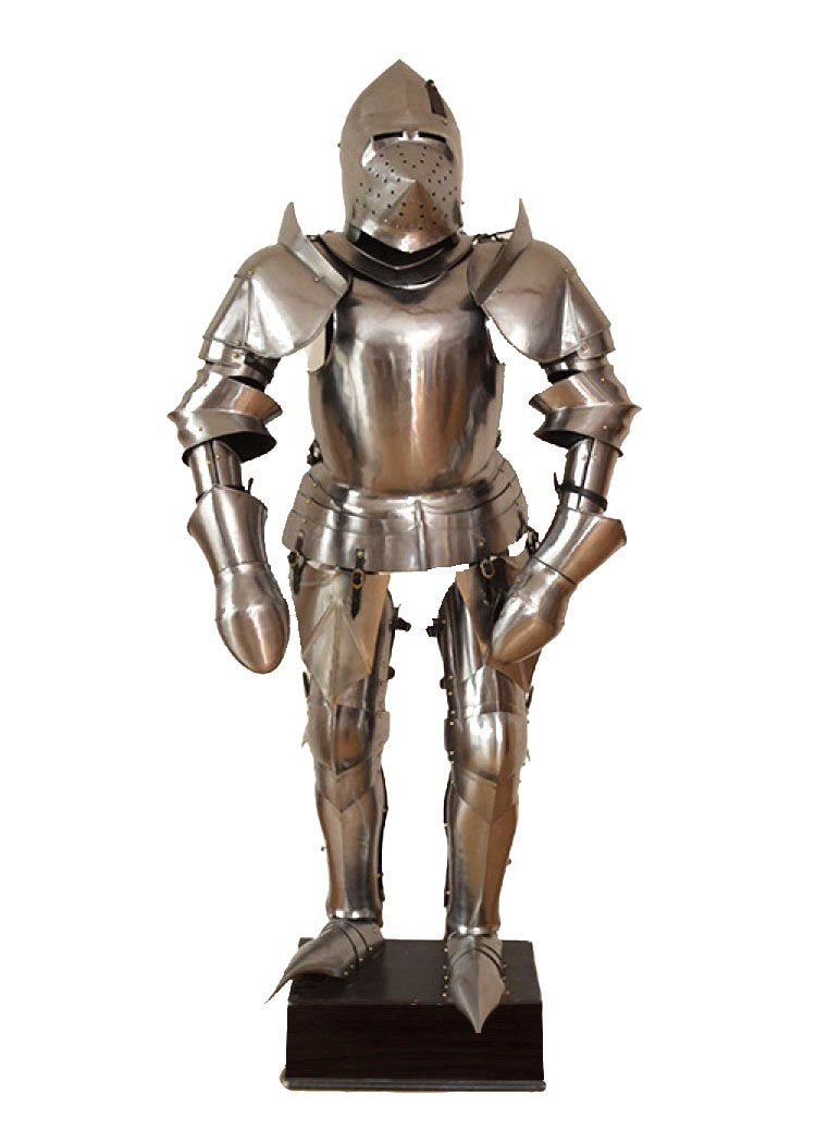 Dieses sehr dekorative Set bestehend aus Hundsgugel, Plattenschultern, Armzeug mit Ellbogenkacheln, Plattenfäustlingen, Brustpanzer, Beintaaschen, Beinzeug mit Kniekacheln und Sabatons. Primär ist dieses Set als Dekorationsstück gedacht und nicht für das Tragen konzipiert, auch wenn das möglich ist.