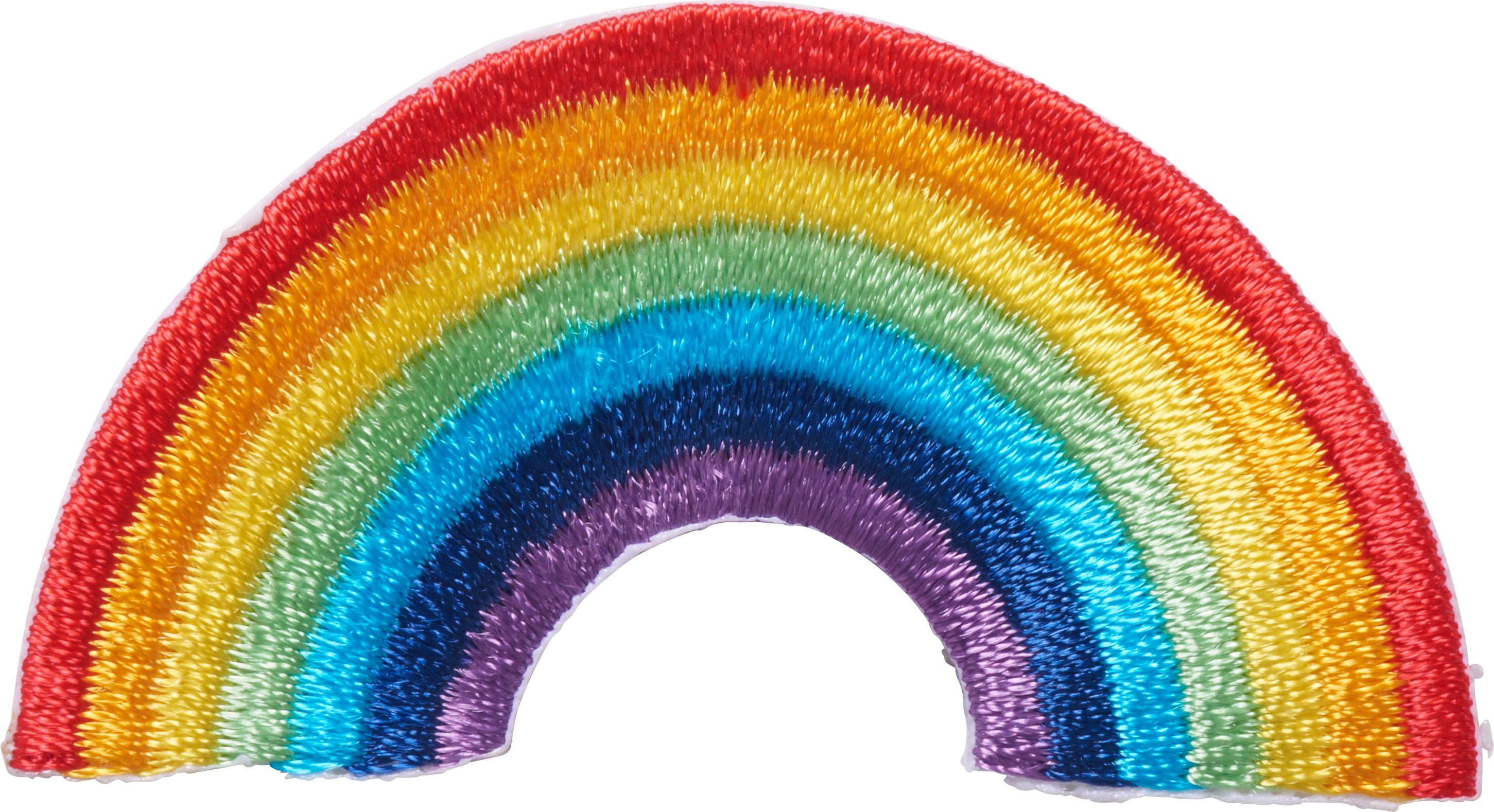 Eine Bügelapplikation 'Regenbogen' von BeaLena, Größe ca. 6 x 3 cm. Perfekt für die Reparatur und zum Aufpeppen von Kleidungsstücken. Das Material ist 100 % Polyester, waschbar bei 30 °C. Die Applikation ist zum Aufbügeln.
