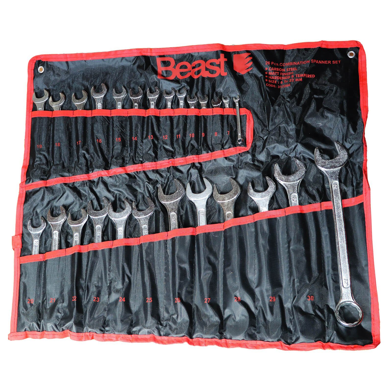 Der 26 teilige Gabel-Ringschlüsselsatz ist ein hochwertiges Werkzeugset für jeden Profi-Handwerker oder Hobby-Mechaniker. Hergestellt aus geschmiedetem Werkzeugstahl, sind die 26 Gabel-Ringschlüssel robust und langlebig.