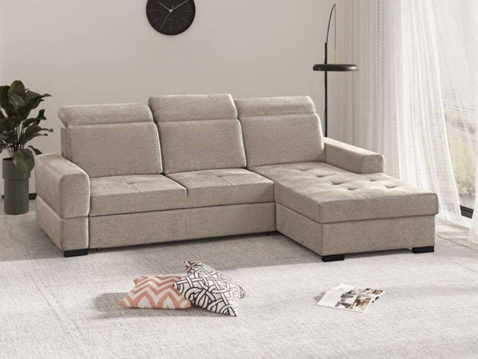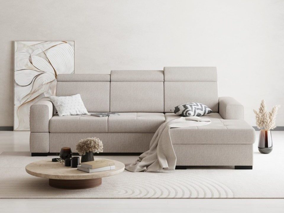 Es ist in universellen, zeitlosen Farben wie Grau- und Beigetönen erhältlich, die sich problemlos an verschiedene Inneneinrichtungen anpassen lassen. Dieses Ecksofa ist eine Kombination aus modernem Design und Komfort und sorgt für Komfort sowohl im Sitzen als auch im Liegen.