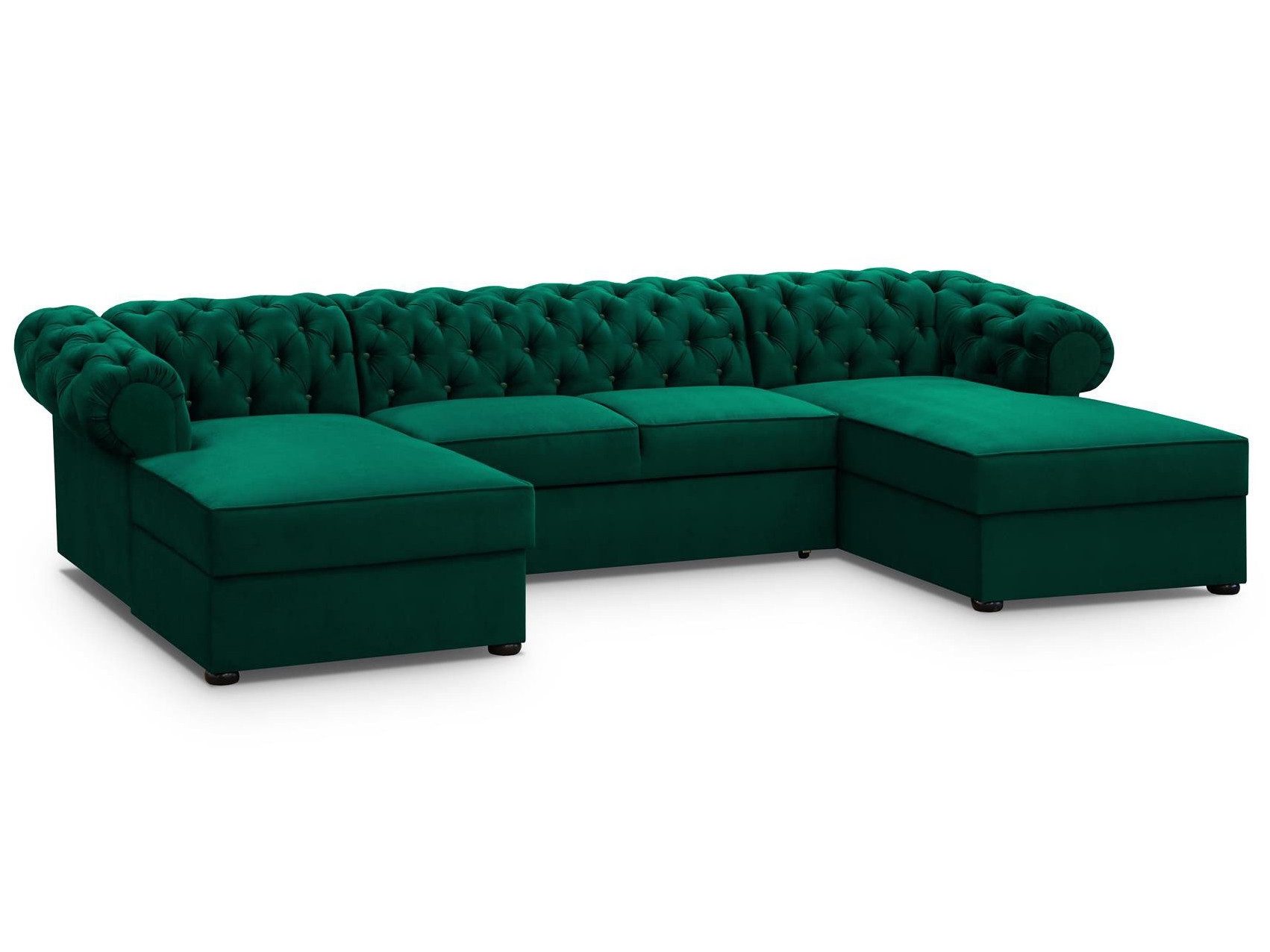 Mit der Delphin-Mechanismus verwandeln Sie das bequeme Ecksofa Chester U mit einer Liegefläche von 281 x 124 cm in einen bequemen Schlafplatz für die Nacht. Praktische Aufbewahrungsbehälter für Textilien bringen Ordnung in Ihr Wohnzimmer. Das bequeme Chester Schlafsofa in U-Form wird solo oder im Duo mit anderen Modellen der Chester-Serie großartig aussehen.