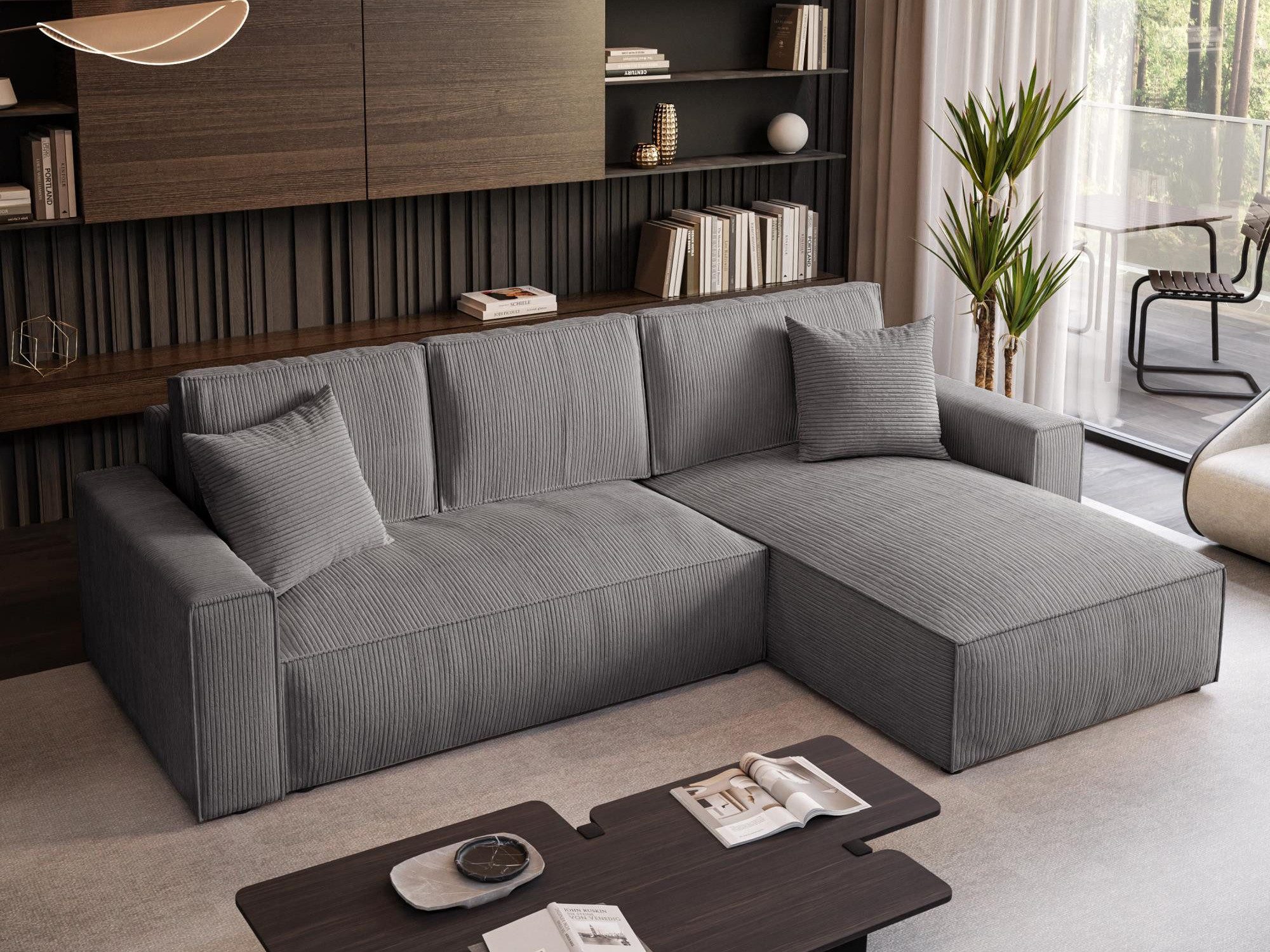 L-Form Ecksofa Parys in fügt sich perfekt in ein trendiges Wohnzimmer ein. Ecksofa 290 cm breit Parys ausgestattet mit einer Schlaffunktion, die eine Schlaffläche von 244 x 140 cm schafft, sowie Bettkasten. Rahmen aus Massivholz und Spanplatte.