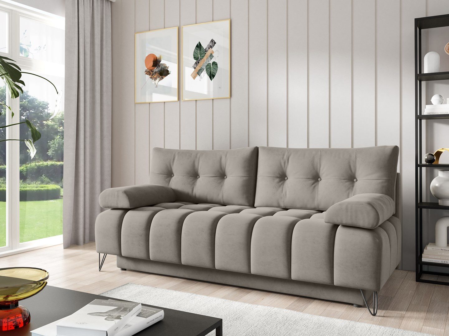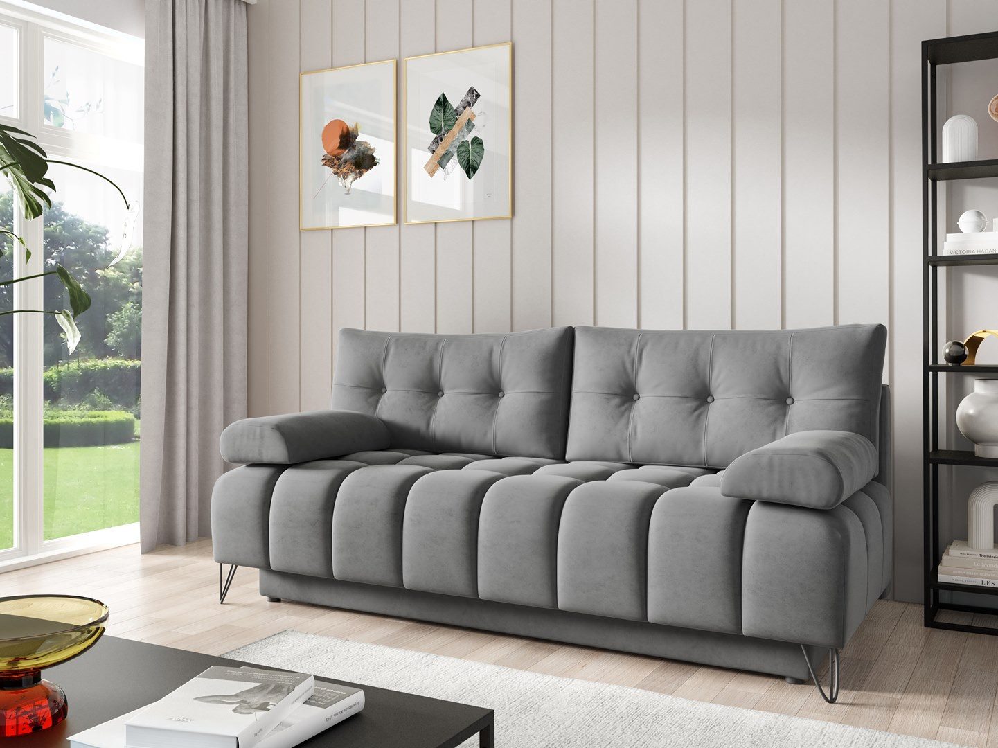 Das Sofa Bergen vereint moderne Eleganz mit praktischer Funktionalität und ist die perfekte Wahl für kleinere Wohnräume oder Gästezimmer. Dank des DL-Ausklappsystems lässt es sich im Handumdrehen in ein komfortables Bett verwandeln – ideal für spontane Übernachtungen. Der integrierte Bettkasten bietet zusätzlichen Stauraum für Kissen und Decken. Die hochwertige Wellenfederung Typ B sorgt sowohl beim Sitzen als auch beim Liegen für optimalen Komfort. Optisch überzeugt das Modell durch seine detailreichen Akzente: dekorative Kissen mit Knopfsteppung, ein markantes Sitzmuster sowie stilvolle Metallfüße im Industrial-Look. Mit seiner klaren Formensprache und den praktischen Funktionen wird das Broadway zum stilvollen Mittelpunkt jeder Einrichtung.