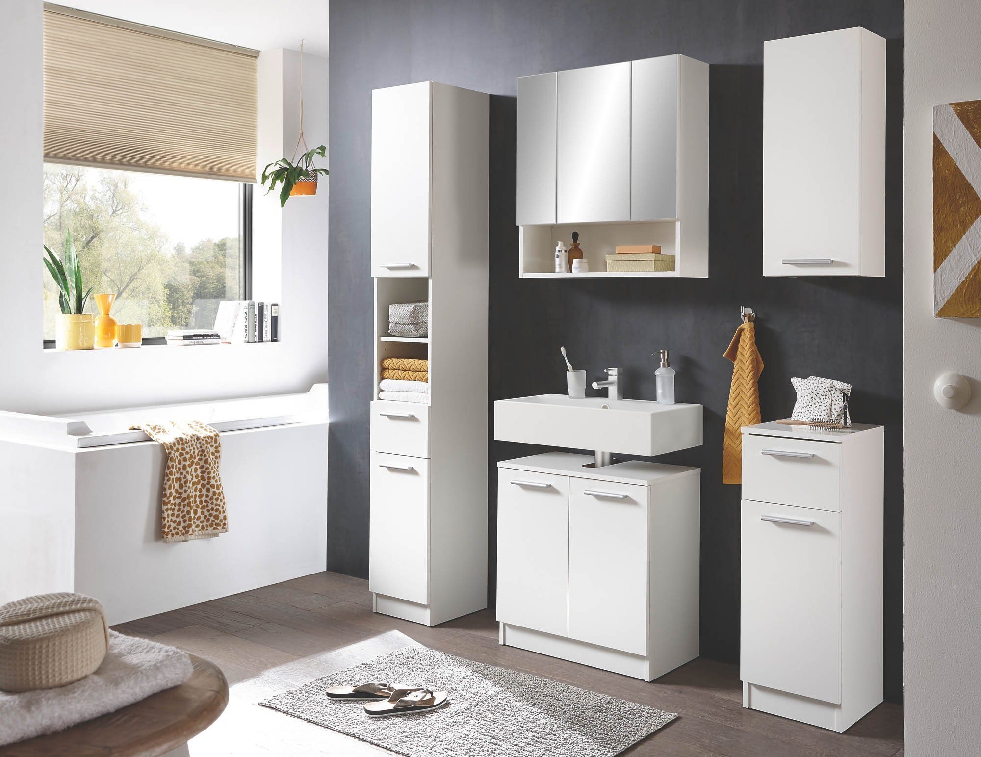 | Set beinhaltet | 1x Hochschrank (B/H/T ca. 30x196x33 cm), 1x Waschbeckenunterschrank (B/H/T ca. 60x62x33 cm), 1x Spiegelschrank (B/H/T ca. 65x70x21 cm), 1x Kommode (B/H/T ca. 30x82x33 cm), 1x Hängeschrank (B/H/T ca. 30x70x20 cm) |