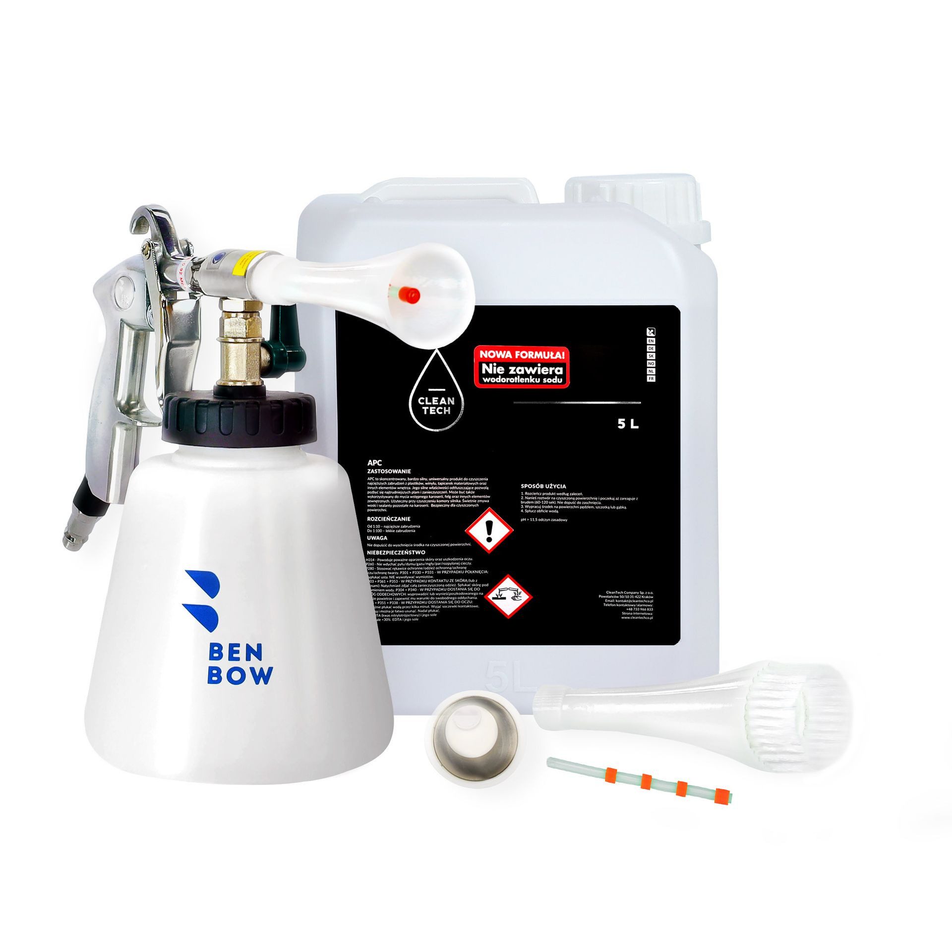 In this set you will receive a Benbow compressed air cleaning gun and a matching APC universal cleaner from CleanTech. The highly effective cleaning agent quickly and thoroughly removes greasy residue from care products or impurities from arm dashboards, middle tunnels and doors. The universal all-purpose cleaner cleans with the help of the cleaning gun and its physical tornado effect, ventilation slots, storage compartments and surfaces on the dashboard. A dilution in the ratio of 1:10 or 1:5 when cleaning the engine compartment, is absolutely sufficient for a thorough cleaning.