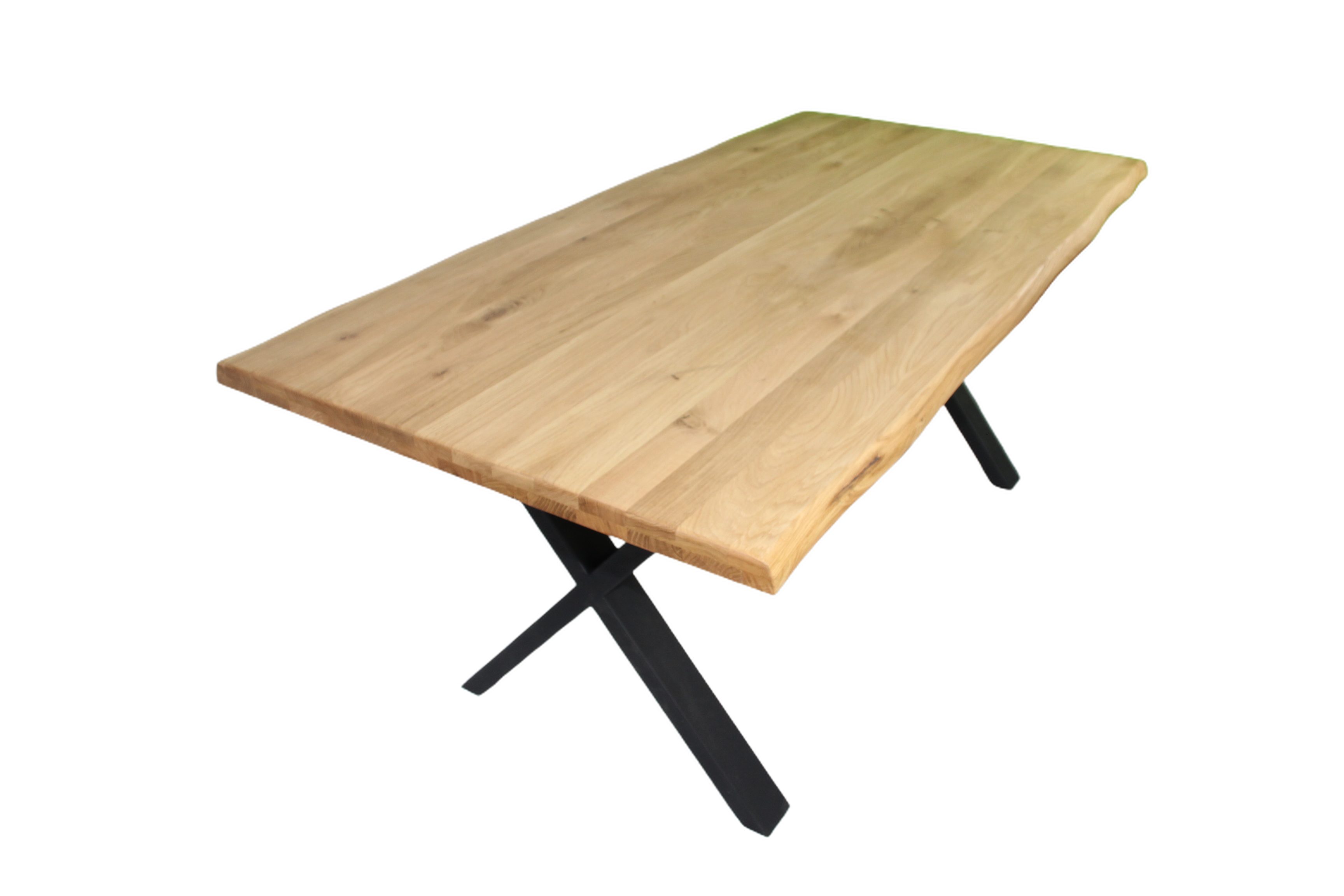 Der Eiche Esstisch mit charaktervoller Baumkante und schwarzem X-Gestell aus Metall verbindet die Wärme von massivem Holz mit der klaren Linie modernen Designs. Jede Tischplatte ist ein Unikat, geprägt von der natürlichen Maserung und Struktur der Eiche, während das stabile X-Gestell für einen robusten Stand sorgt und einen industriellen Akzent setzt.