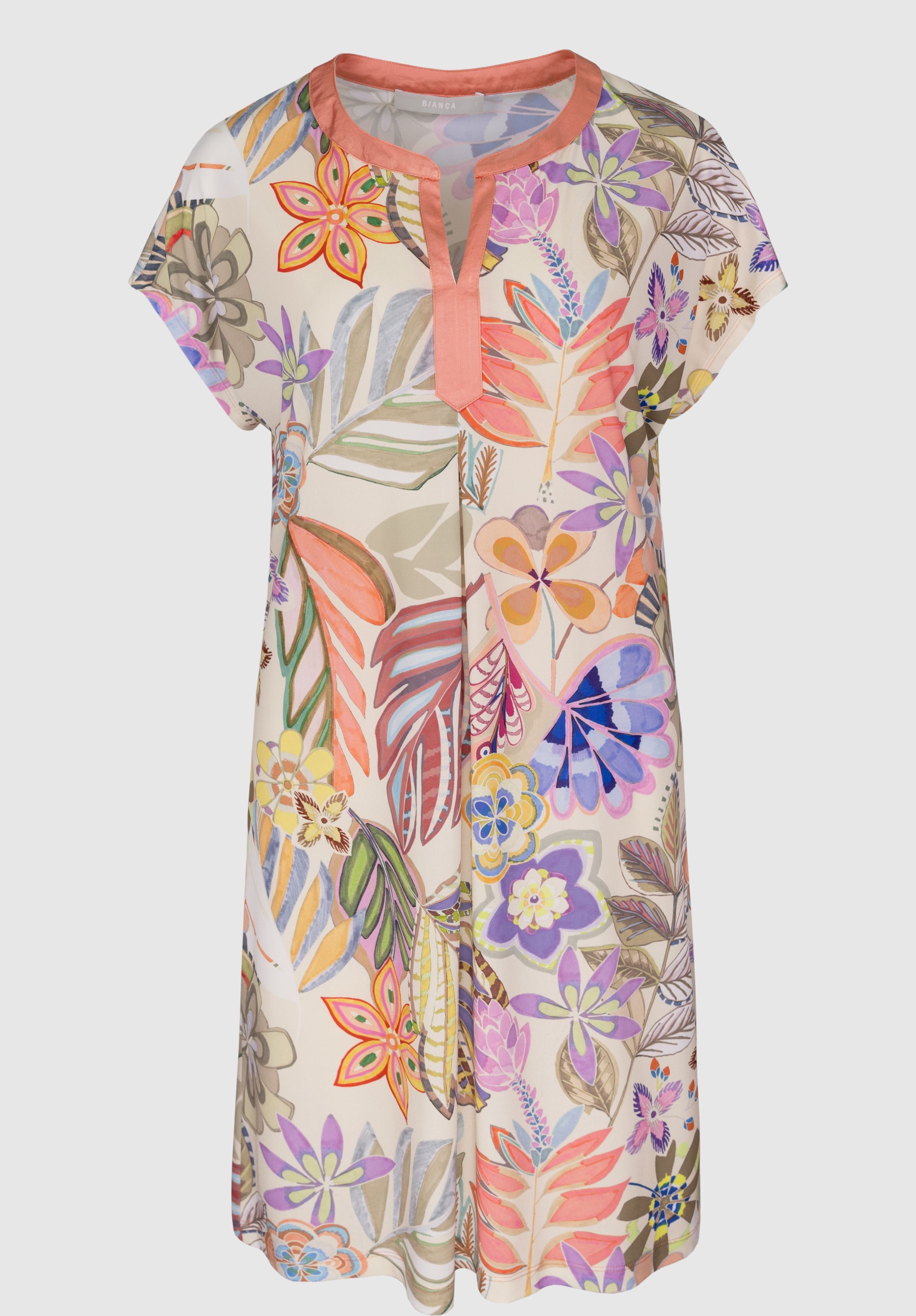 Der florale Print kommt in der Farbe "beige mix" und wirkt in Kombination mit dem kontrastigen Beleg am Ausschnitt und dem überschnittenen Kurzarm sehr modern. Der Rundhalsausschnitt mit V-Cut-Out hat im Anschluss eine dezente Faltengebung, damit umspielt der Schnitt schmeichelnd die Figur! Somit ist Manu der perfekte Begleiter: Ob für den Alltag oder etwas schicker für die nächste Party. Außerdem ist der hochwertige Techno-Jersey super pflegeleicht und eignet sich hervorragend für Sommerreisen!