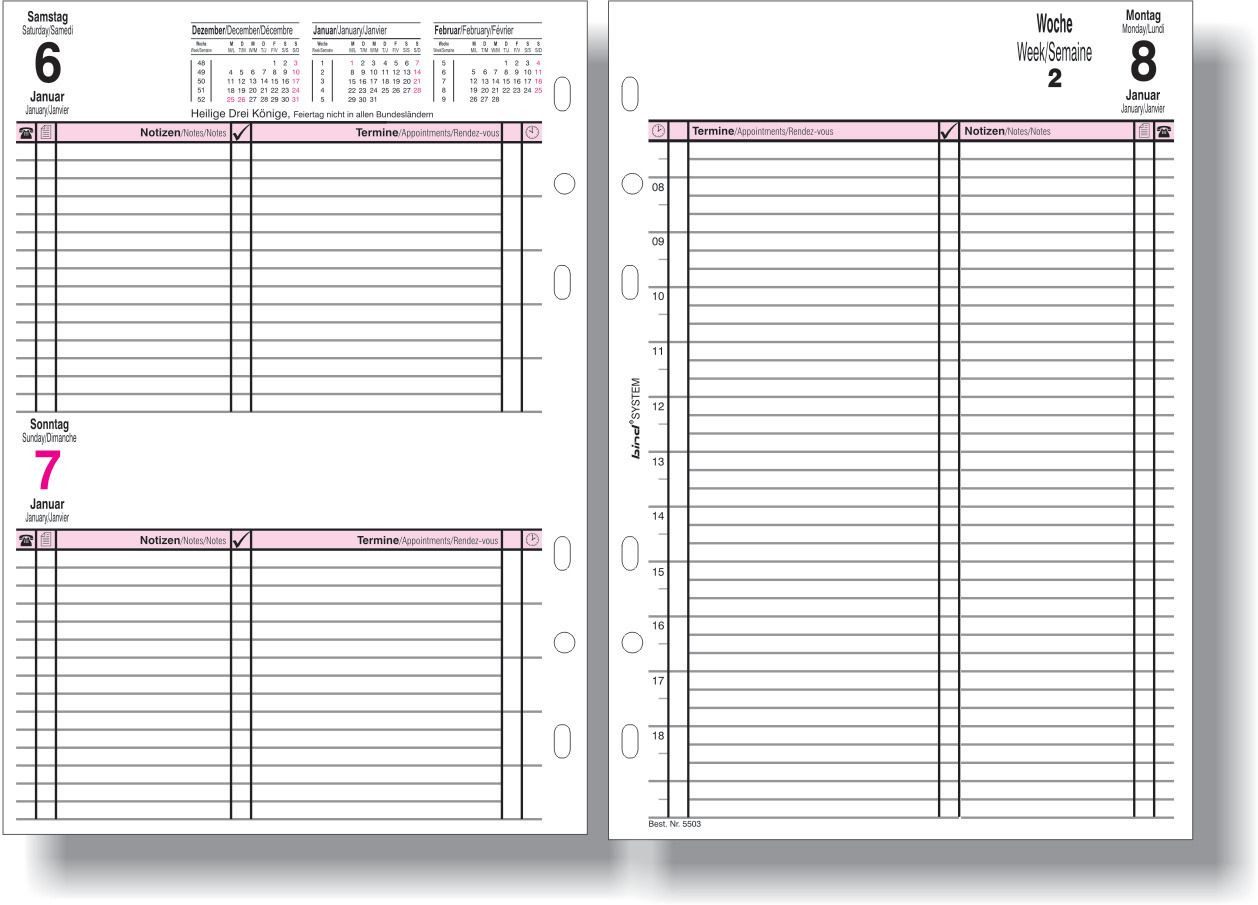 bind®-Terminplanereinlagen sind mit einer universellen 6- Ringlochung ausgestattet. Daher passend für alle handelsüblichen Terminplansysteme im Format A5. Manager Kalender A5. Verwendung für Produkt: Bind System. Blattgröße (B x H) und Lochung: 148 x 210 mm, 6-Ring-Lochung. 3-sprachig D/E/F, Lochabstand 13/13/59/13/13. Kalendarium: 1 Tag/1 Seite.