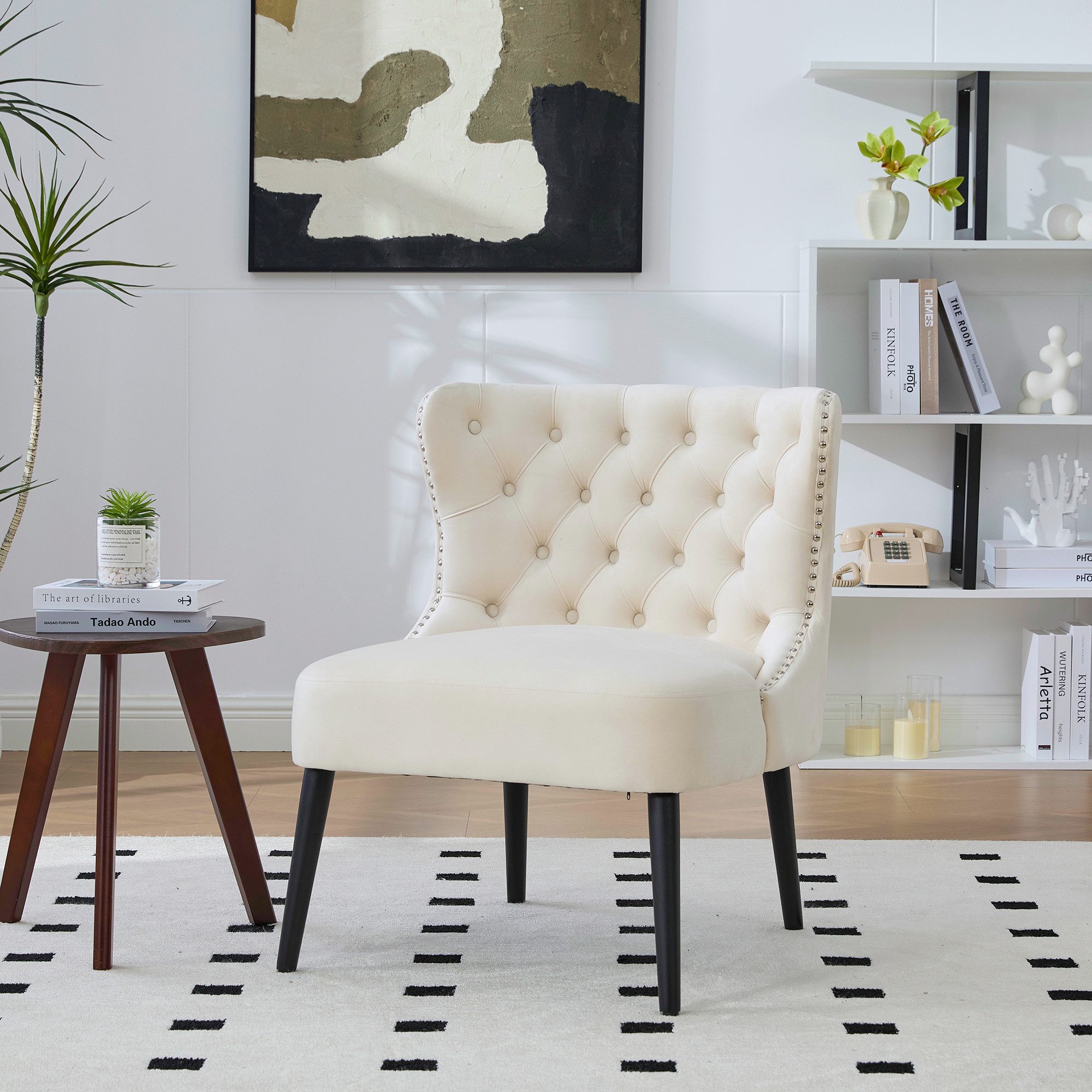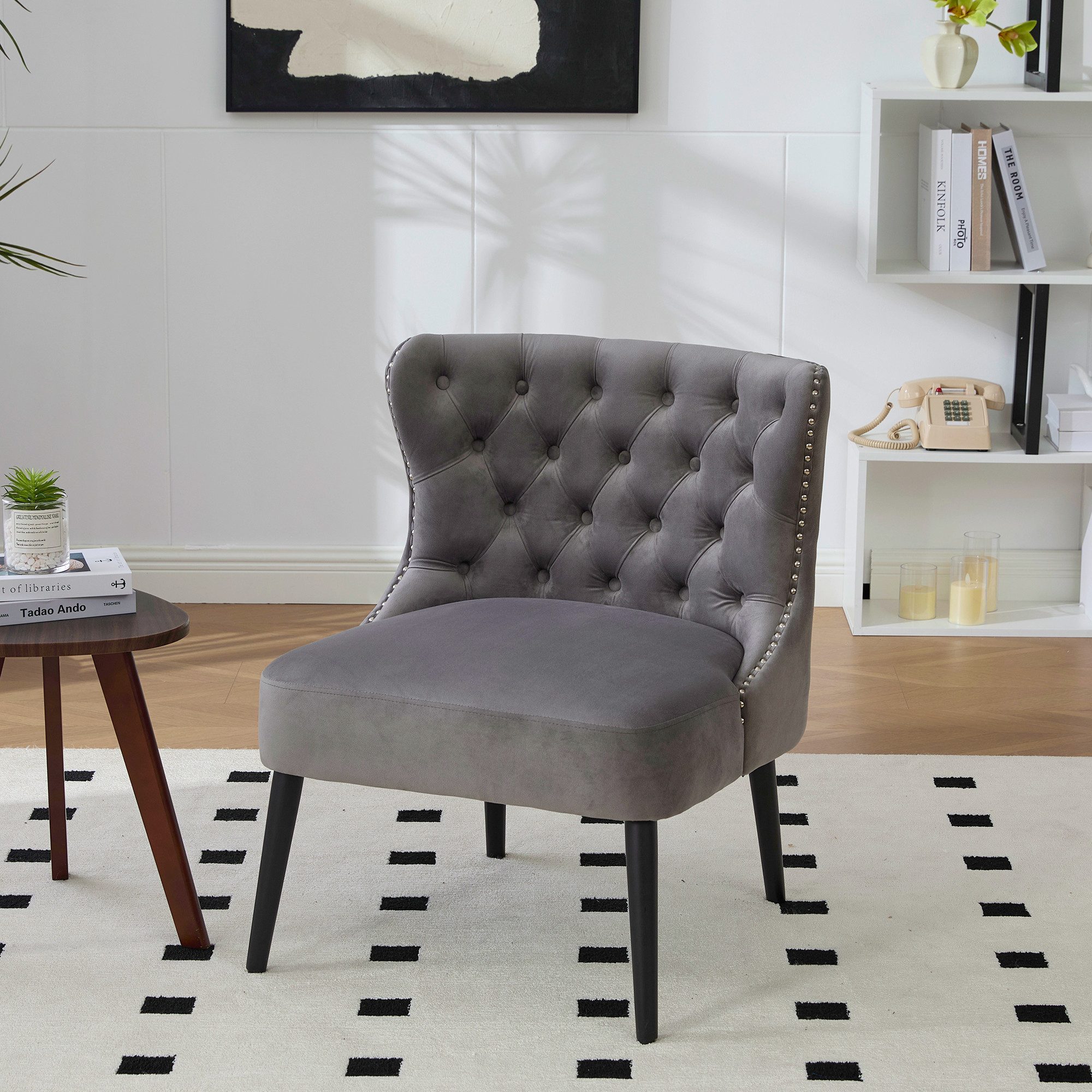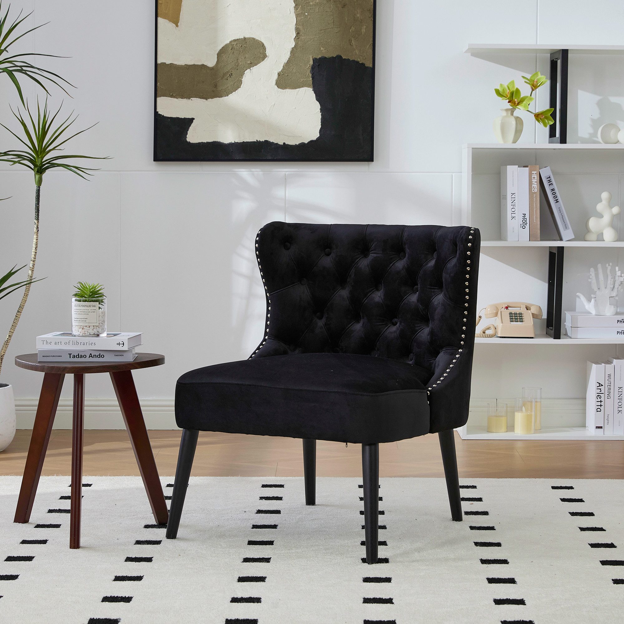 Dieser elegante Loungesessel verbindet klassisches Design mit modernem Komfort. Der hochwertige Samtbezug fühlt sich glatt und zart an und verleiht dem Stuhl eine luxuriöse Ausstrahlung. Die Rückenlehne ist mit einem klassischen Diamant-Steppmuster sowie dekorativen Metallnieten versehen, die in Handarbeit angebracht wurden – ein edles Detail, das Stilbewusstsein und Raffinesse unterstreicht.