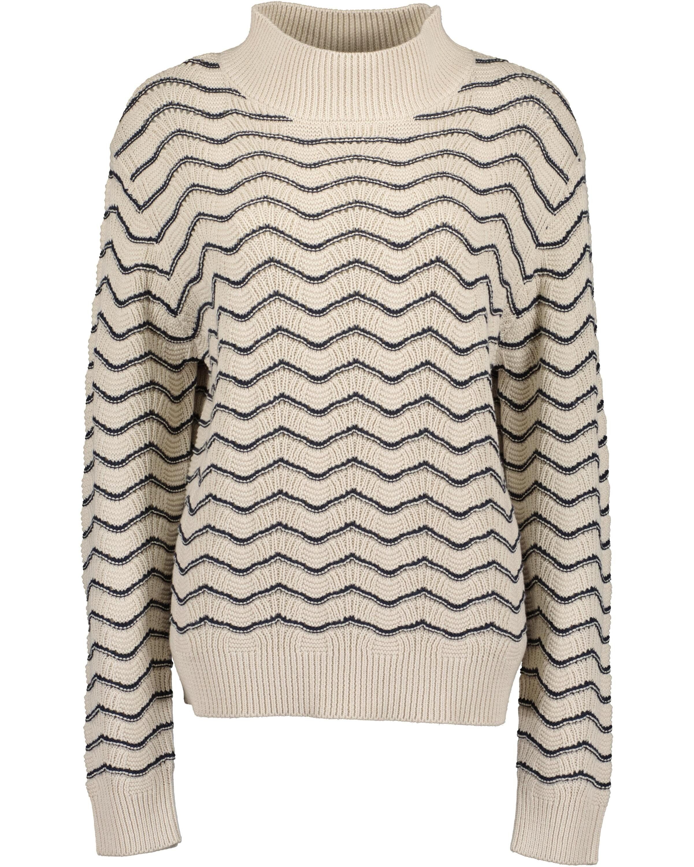 Der Strickpullover mit Stehkragen für Damen präsentiert sich mit kontrastierenden Zick-Zack-Streifen für ein klassisches, zeitloses Design. Die gerippten Bündchen an Ärmeln und Saum sorgen für eine optimale Passform.