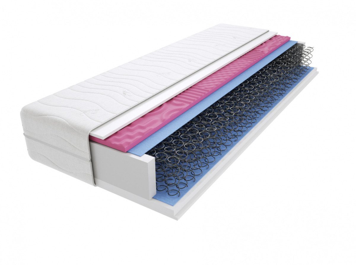 Hochflexibler HR-Schaum - mit einer Dichte von 35 kg/m3 - dieser Schaum besteht aus einer Vielzahl von Luftblasen, sorgt für eine perfekte Körperanpassung, sehr guten Schlafkomfort und garantiert eine perfekte Belüftung der Matratze. Die erhöhte Dichte des HR-Schaums verlängert die Haltbarkeit der Matratze im Vergleich zum oft verwendeten T25-Polyurethanschaum erheblich. Bonellfedern - dieser Feder zeichnet sich durch die sogenannte Oberflächenelastizität. Was bedeutet das? Je größer der Druck auf die Matratze, desto größer der Widerstand der Federfläche. Je niedriger der Druck, desto geringer der Widerstand. Dadurch ist die Matratze aus Bonellfedern sehr flexibel und universell einsetzbar. Geeignet für Personen in einem großen Gewichtsbereich. Eine so konstruierte Matratze kann Menschen empfohlen werden, die ihren Nutzungskomfort, ihre Vielseitigkeit zu einem sehr günstigen Preis schätzen. Hochflexibler HR-Schaum - mit einer Dichte von 35 kg/m3 - dieser Schaum besteht aus einer Vielzahl von Luftblasen, sorgt für eine perfekte Körperanpassung, sehr guten Schlafkomfort und garantiert eine perfekte Belüftung der Matratze. Die erhöhte Dichte des HR-Schaums verlängert die Haltbarkeit der Matratze im Vergleich zum oft verwendeten T25-Polyurethanschaum erheblich. Gesteppter Bezug - mehrere Bezugsarten zur Auswahl, hypoallergenes, antiallergisches Material, mit einem L-förmigen Reißverschluss. Der Bezug ist abnehmbar und waschbar (Waschen mindestens alle sechs Monate empfohlen). Wichtig: Der Bezug kann je nach Größe eine andere Anordnung von Inschriften und Zeichen aufweisen. Das Bezugsmuster kann geringfügig von dem auf dem Foto gezeigten abweichen. Die in der Visualisierung verwendeten Farben Farben sind illustrativ und können von den tatsächlichen Farben abweichen, die Eigenschaften der einzelnen Ebenen bleiben jedoch erhalten.