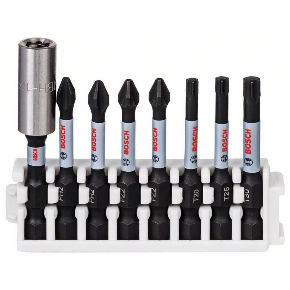 Das Impact Control Schrauberbit ist äußerst robust, ideal für schwere Arbeiten geeignet und hält selbst dem großen Drehmoment von Schlagschraubern stand. Die spezielle Torsionszone verleiht den Bits extreme Haltbarkeit für Dauerbelastung. S2-modifizierter Stahl und optimierter Wärmebehandlungsprozess verleihen höchste Haltbarkeit für Bestleistungen, selbst bei umfangreichen Montagen und schweren Industriearbeiten. Es besitzt einen Außensechskantschaft der Größe 1/4 Zoll zur Verwendung mit Bohrschraubern, Schraubendrehern und besonders mit Schlagschraubern. Das Schrauberbit ist Teil des Bosch Pick and Click-Systems, das individuell zusammenstellbare Zubehörsets für absolut flexible Bit-Sortimente ermöglicht. Einrasteinschübe sichern einzeln gekaufte Bitpacks für eine individuelle Sammlung und den einfachen Austausch von alten Bitpacks. Die Bits werden in einem Kunststoffhalter geliefert, der einfach in die Pick and Click Leerboxen M und L einrastet und individuell zusammengestellte Bitsets ermöglicht. Das 36-teilige Pick and Click Impact Control Schrauberbitset enthält auch Steckschlüssel sowie den Impact Control-Universalhalter mit Standardmagnet und den Impact Control-Universal Holder Quick Release. Diese Halter sind ideal für besonders guten Halt der Bits bei allgemeinen Schraubarbeiten mit Elektrowerkzeugen geeignet. Die Quick-Change-Funktion ermöglicht hingegen schnelle und einfache Bitwechsel und einen kraftschlüssigen Sitz des Bits. Länge mm: 50, 50.