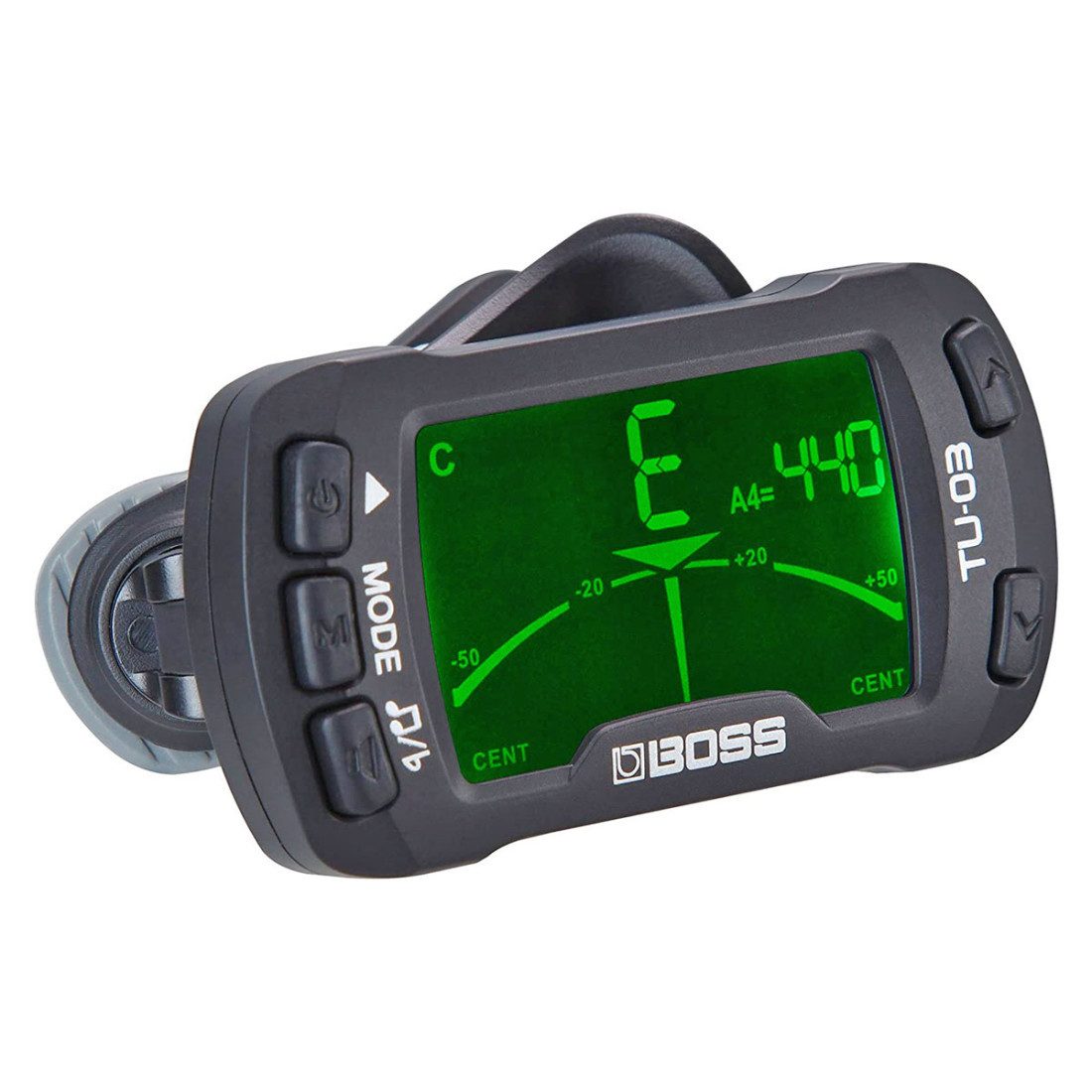 Das Boss TU-03 erfüllt sowohl die Funktionen eines Stimmgeräts als auch dieeines Metronoms. Dank der praktischen Clip-Funktion kannder kompakte Tuner einfach an der Kopfplatte von Saiteninstrumenten wie Gitarre oder Bass befestigt werden.