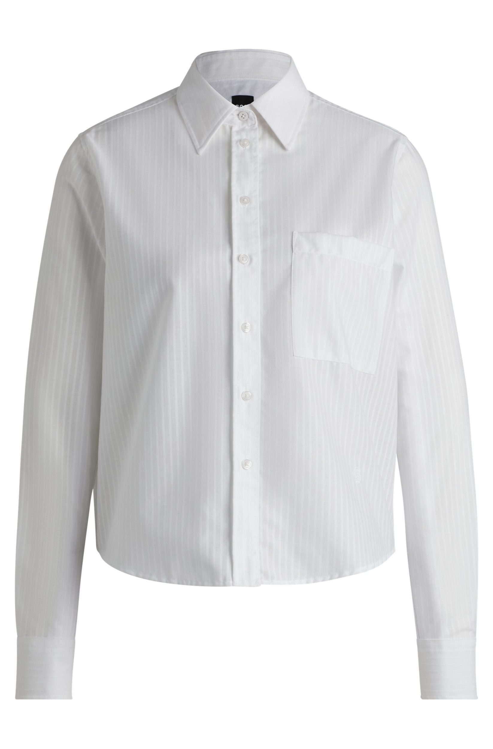 Ein charakteristisches Highlight dieser BOSS Bluse ist das gestickte Double-B-Monogramm, das stilvolle Akzente setzt. Die Regular-Fit Bluse bietet Dir dank ihres geraden Schnitts und der weichen, gestreiften Baumwolle ein angenehmes Tragegefühl. Der Spitzkragen und der verdeckte Verschluss verleihen dem Design eine elegante Note, perfekt für Deinen Business-Alltag. Die langärmelige Bluse ist unifarben und passt sich somit vielseitig an verschiedene Outfits an.Durch die Verwendung von 100 % Baumwolle bleibt die Bluse auch nach vielen Waschgängen formstabil und behält ihre Farbe. Die Knopf-Manschetten und die aufgesetzten Brusttaschen unterstreichen das klassische Design und bieten gleichzeitig praktische Funktionen. Die Spatentaschen oben runden das Gesamtbild ab und verleihen der Bluse zusätzlichen Charme. Dieses Kleidungsstück ist ein unverzichtbarer Bestandteil Deiner Business-Garderobe, das Dir sowohl Komfort als auch Stil bietet.Die Regular-Fit Passform sorgt dafür, dass Du Dich den ganzen Tag über wohlfühlst, ohne dabei auf einen professionellen Look verzichten zu müssen. Der Kent-Kragen gibt der Bluse eine zusätzliche Struktur und lässt sich gut mit verschiedenen Accessoires kombinieren. Ob Du sie mit einem Blazer oder einer schicken Hose trägst, die Bluse fügt sich nahtlos in Dein Outfit ein und verleiht Dir einen souveränen Auftritt.Für besondere Gelegenheiten im beruflichen Umfeld ist diese Bluse ideal geeignet. Sie vereint klassische Eleganz mit modernen Details und ist somit ein vielseitiges Kleidungsstück. Dank der hochwertigen Verarbeitung und des zeitlosen Designs kannst Du sie immer wieder neu kombinieren. Die Regular-Fit Bluse ist ein Must-have für jede Garderobe, die auf stilvolle und funktionale Kleidung setzt. Charakteristisches Double-B-Monogramm Verdeckter Verschluss und Kent-Kragen Langärmlig mit Knopf-Manschetten0