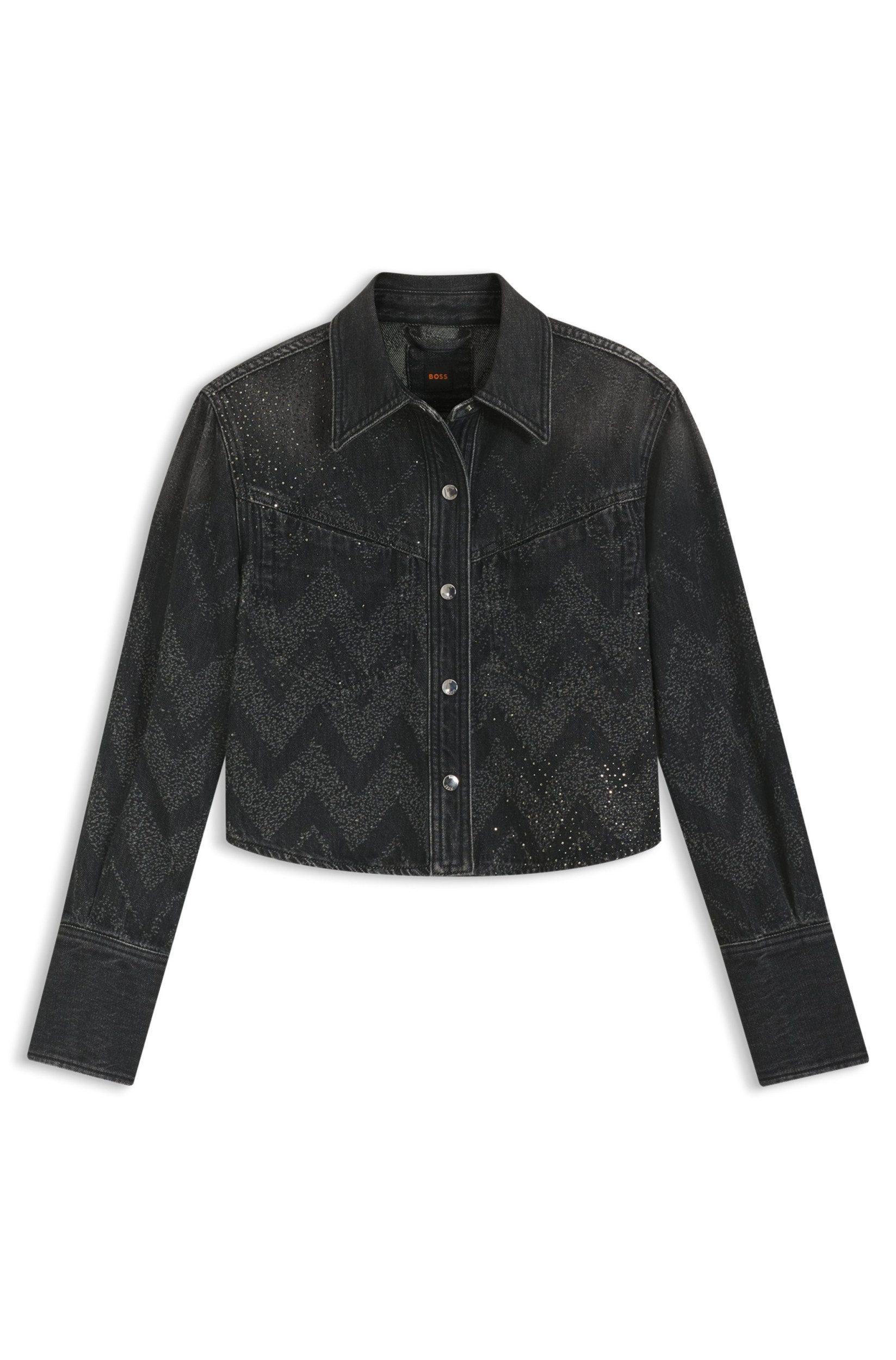 Verliebe Dich in den neuen Klassiker: Die Jeans Bluse von BOSS OrangeTräumst Du von einem Kleidungsstück, das sowohl stylisch als auch bequem ist? Die Jeans Bluse von BOSS Orange könnte genau das Richtige für Dich sein! Dieses Stück vereint klassischen Charme mit modernen Akzenten und wird schnell zu Deinem neuen Lieblingsbegleiter in jeder Situation.Einzigartige Details, die begeisternDie BOSS Bluse zeichnet sich durch eine gelaserte Struktur aus, die ihr ein einzigartiges, fast dreidimensionales Aussehen verleiht. Um das Ganze noch abzurunden, sind schimmernde Kristalle eingearbeitet, die je nach Lichteinfall sanft glitzern. Diese Details machen die Bluse zu einem echten Hingucker, ohne dabei aufdringlich zu wirken.Perfekt für jeden AnlassOb für das Büro, einen entspannten Stadtbummel oder einen Abend mit Freunden – diese Bluse passt sich mühelos jedem Anlass an. Der feste Denim in Schwarz sorgt für eine edle Optik, während die Cropped-Länge einen modernen, jugendlichen Touch hinzufügt. Kombiniere sie mit einer High-Waist Hose oder einem schicken Rock, um verschiedene Looks zu kreieren.Qualität, die man fühltHergestellt aus 100% Baumwolle, bietet diese Bluse nicht nur visuellen Genuss, sondern auch hervorragenden Tragekomfort. Baumwolle ist bekannt für ihre Atmungsaktivität und Hautfreundlichkeit, sodass Du Dich den ganzen Tag über wohl fühlen kannst, ohne Kompromisse bei Deinem Stil eingehen zu müssen. Einzigartige gelaserte Struktur mit schimmernden Kristallen Vielseitig kombinierbar für verschiedene Anlässe Hochwertiger, fester Denim in edlem Schwarz Angenehmer Tragekomfort dank 100% Baumwolle Trendige Cropped-Länge für einen modernen LookVerpasse nicht die Chance, Deine Garderobe mit dieser besonderen Jeans Bluse von BOSS Orange zu bereichern. Sie bietet Dir nicht nur einen hervorragenden Tragekomfort, sondern auch das gewisse Etwas, das Deine Outfits von anderen abheben lässt.