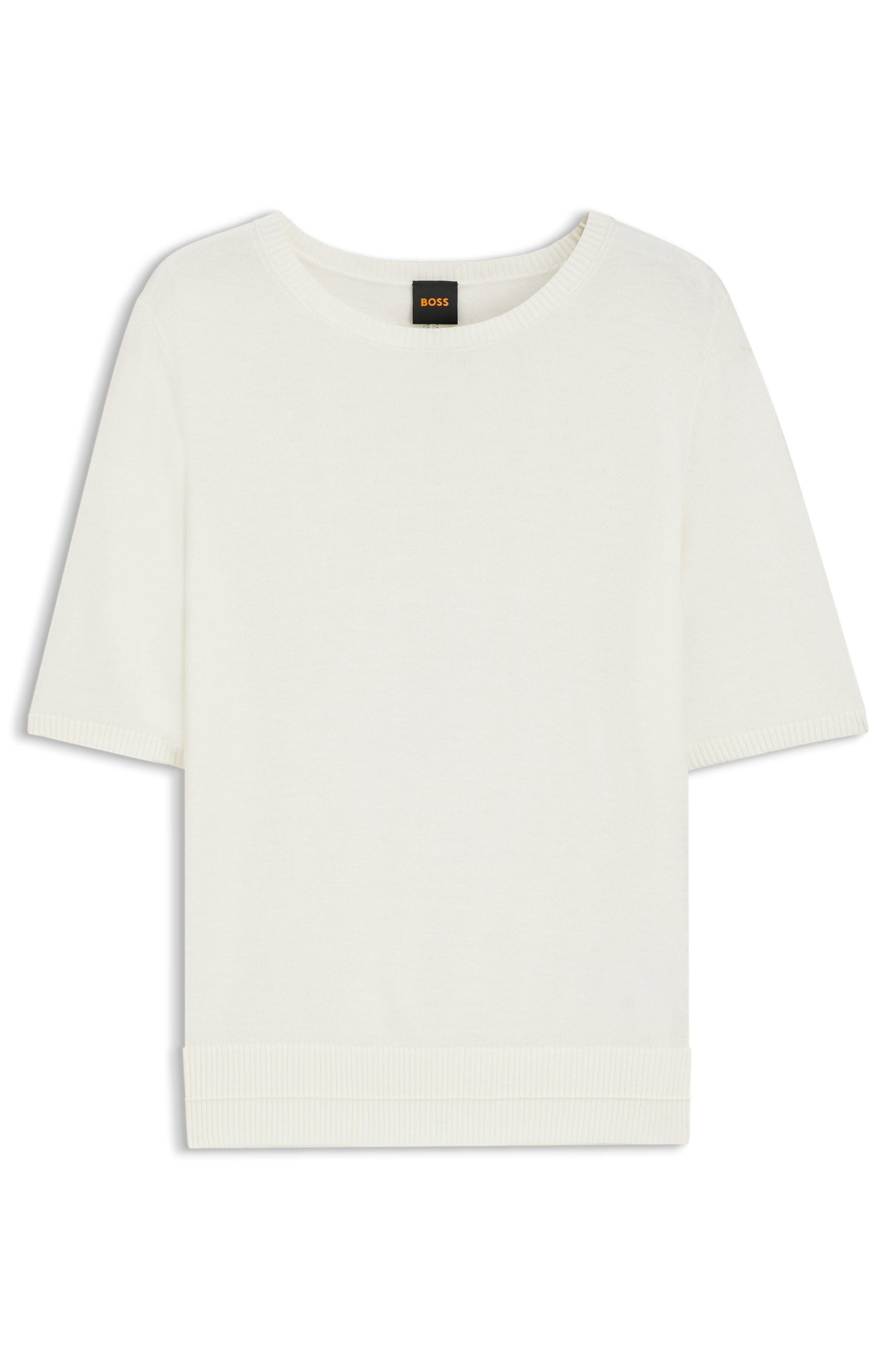 Der elegante BOSS Pullover mit feinem Kaschmir-Anteil überzeugt durch seinen dezenten Schimmer und das edle Lochmuster auf der Rückseite, das dem Design eine feminine, raffinierte Note verleiht. Eine dezente Logo-Stickerei und der Saum mit Ottoman-Struktur unterstreichen die hochwertige Verarbeitung und die Liebe zum Detail. Hergestellt aus nachhaltigen Zellulosefasern, die aus Holz aus verantwortungsvoll bewirtschafteten Wäldern gewonnen werden, vereint dieser Pullover Luxus und Umweltbewusstsein. BOSS engagiert sich gemeinsam mit externen Organisationen für den Schutz von Urwäldern und gefährdeten Ökosystemen, um natürliche Ressourcen langfristig zu bewahren. Der Pullover bietet ein besonders weiches Tragegefühl, exzellenten Komfort und zeitlose Eleganz – ideal für Büro, Freizeit oder besondere Anlässe. Entdecken Sie mit diesem BOSS Pullover nachhaltige Premium-Mode, die Stil, Qualität und Verantwortung perfekt miteinander verbindet. Ein echtes Highlight für Ihre Garder
