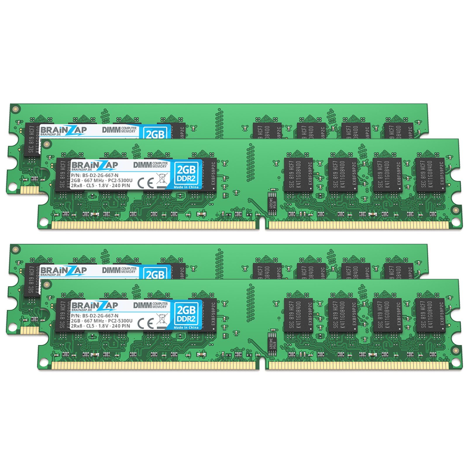 Unser 8GB DDR2 RAM Speicherkit besteht aus 4 Modulen mit jeweils 2GB Kapazität mit der Artikelnummer BS-D2-8GK4-667-N läuft mit 1.8V und wird nach höchsten Qualitätstandards hergestellt und überprüft.