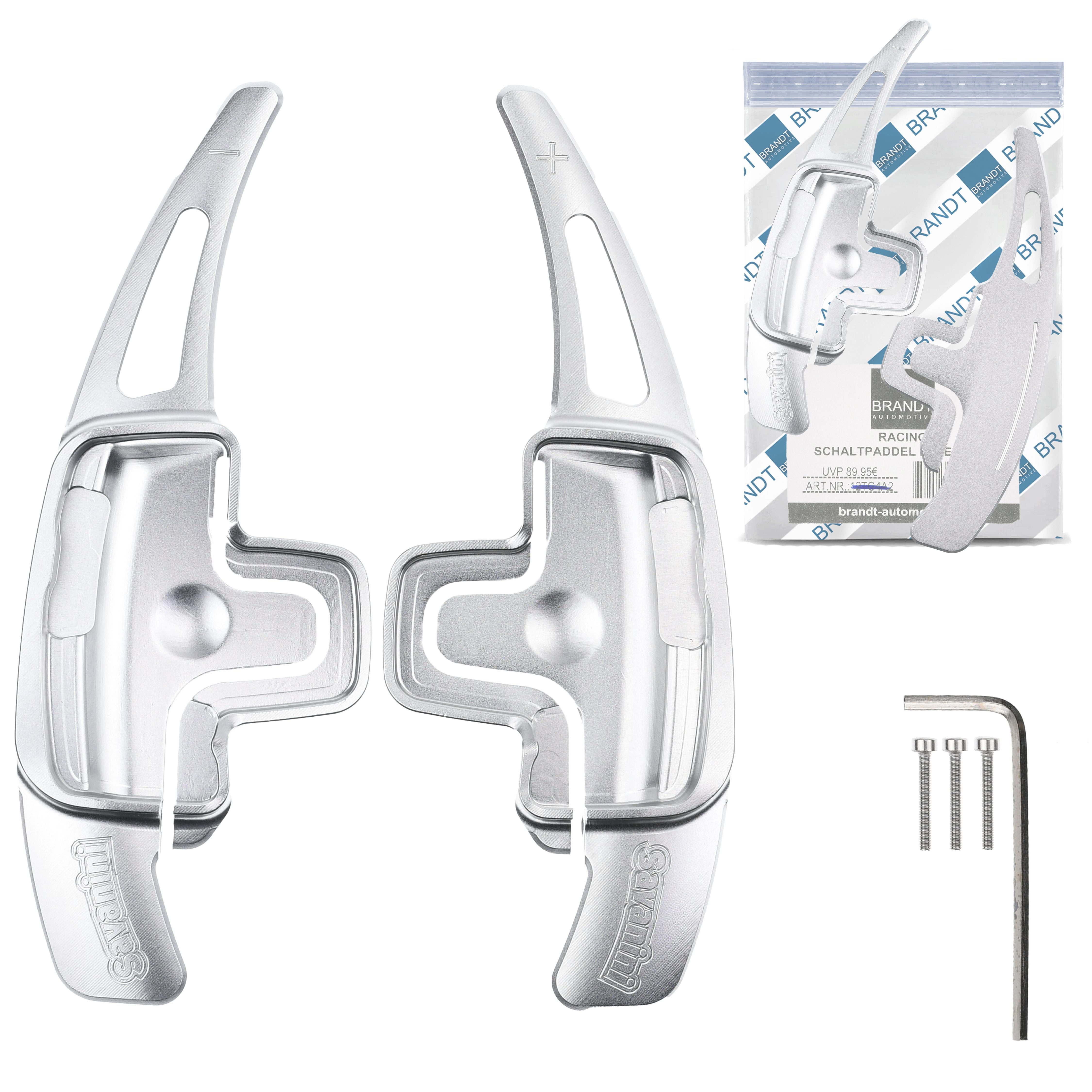 | Lieferumfang | 1x BRANDT AUTOMOTIVE Schaltwippen Verlängerung (PAAR - SILBER) links (-) + rechts (+), 1x Schraubensatz inkl. Sechskantschlüssel |