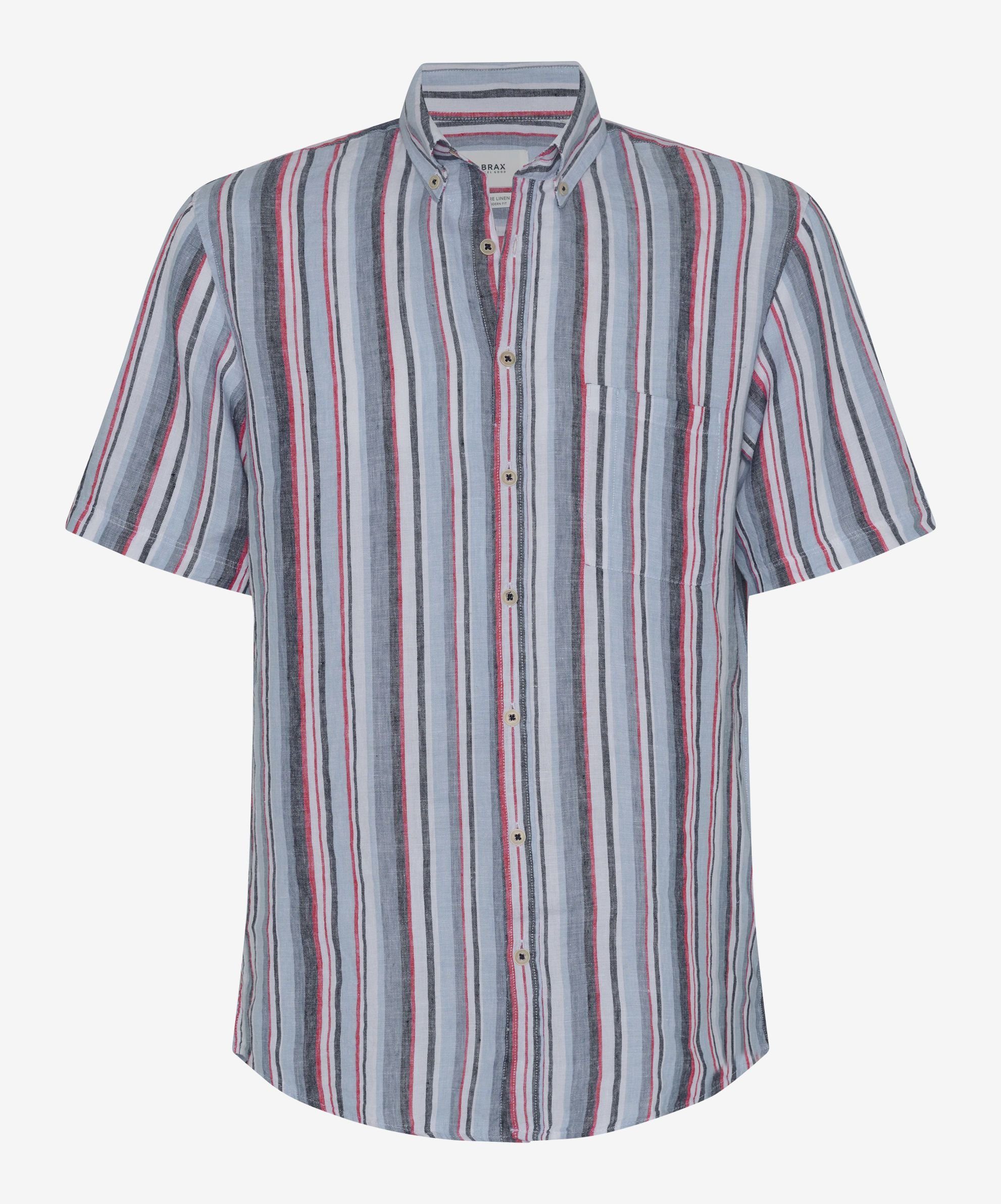 Inbegriff eines sportiven Sommerlooks: das Herrenhemd im Style DAN. Mit seinem klassischen Button-Down-Kragen und einer praktischen aufgesetzten Brusttasche kombiniert es traditionelle Designelemente mit einem modernen Twist. Der Blickfang dieses Halbarmhemdes ist jedoch sein trendiger Multicolour-Streifen, der frisch und dynamisch wirkt. Gefertigt aus reinem Leinen, steht das Hemd nicht nur für modisches Bewusstsein, sondern auch für Tragekomfort. Die strapazierfähige Naturfaser ist dank ihrer atmungsaktiven und kühlenden Eigenschaften perfekt für die warme Jahreszeit geeignet.Form: * Herrenhemd * Halbarm * Button Down-Kragen * Aufgesetzte Brusttasche * Durchgehende Knopfleiste * Modern Fit * Leicht taillierte Silhouette Material: * Lässige Leinen-Qualität * Aus reinem Leinen gefertigt * Leinen: feste, feuchtigkeitsaufnehmende Faser mit kühlendem Effekt * Absolut hautsympathisch * Atmungsaktiv * Strapazierfähig * Typisches Material für den Sommer Details/Verarbeitung: * Moderne Streifenoptik * Multicolour * Dezentes Label Maße: * Rückenlänge bei Größe M (50): 76 cm * Unser Model trägt Größe M (50) und ist 188 cm groß