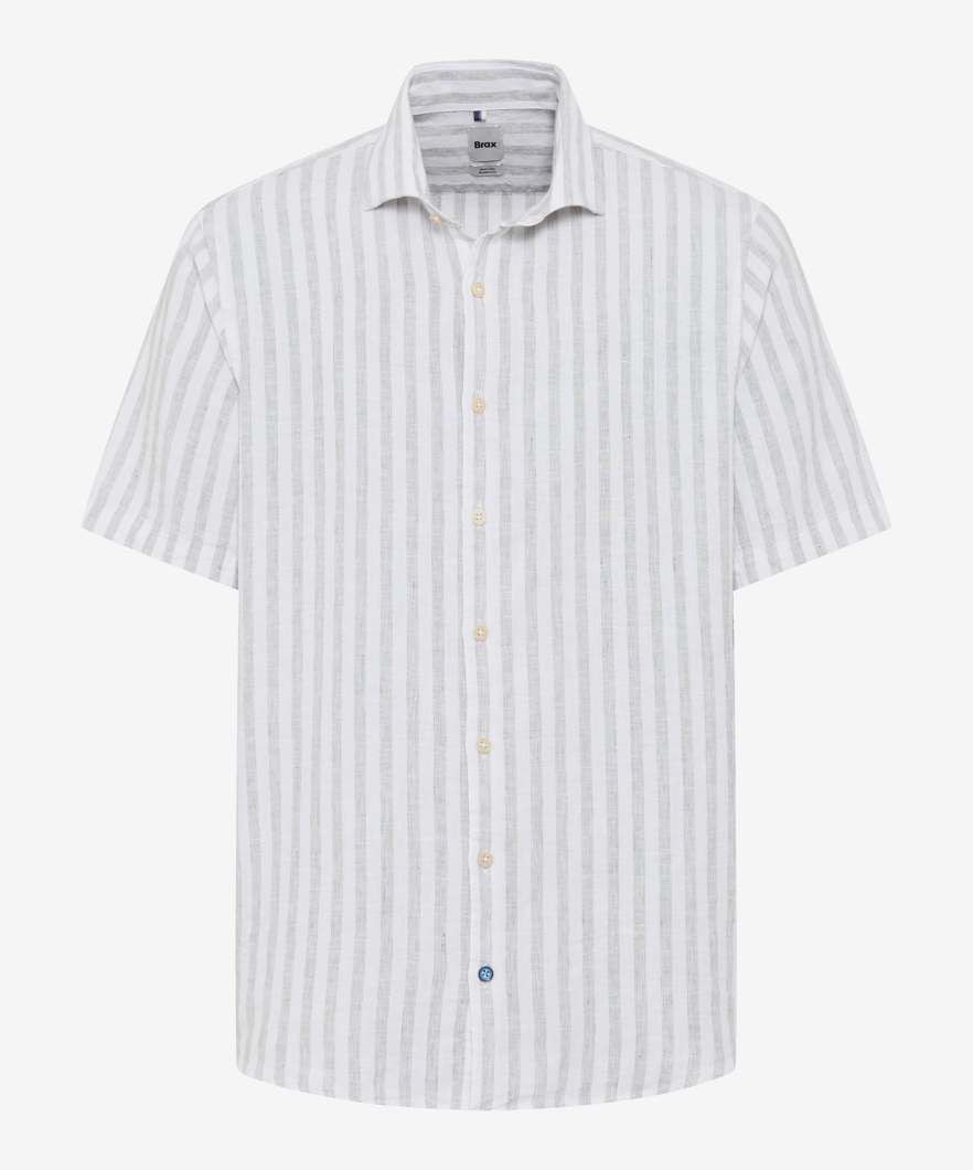 Das Kurzarmhemd Style Hardy von Brax für Herren verbindet maskulinen Chic mit sommerlicher Leichtigkeit. Mit seinem dezenten Streifenmuster, dem markanten Haifischkragen und der taillierten Passform bringt es moderne Eleganz in jeden Look. Der hochwertige Leinen-Baumwoll-Mix sorgt für optimalen Komfort, auch an warmen Tagen.
