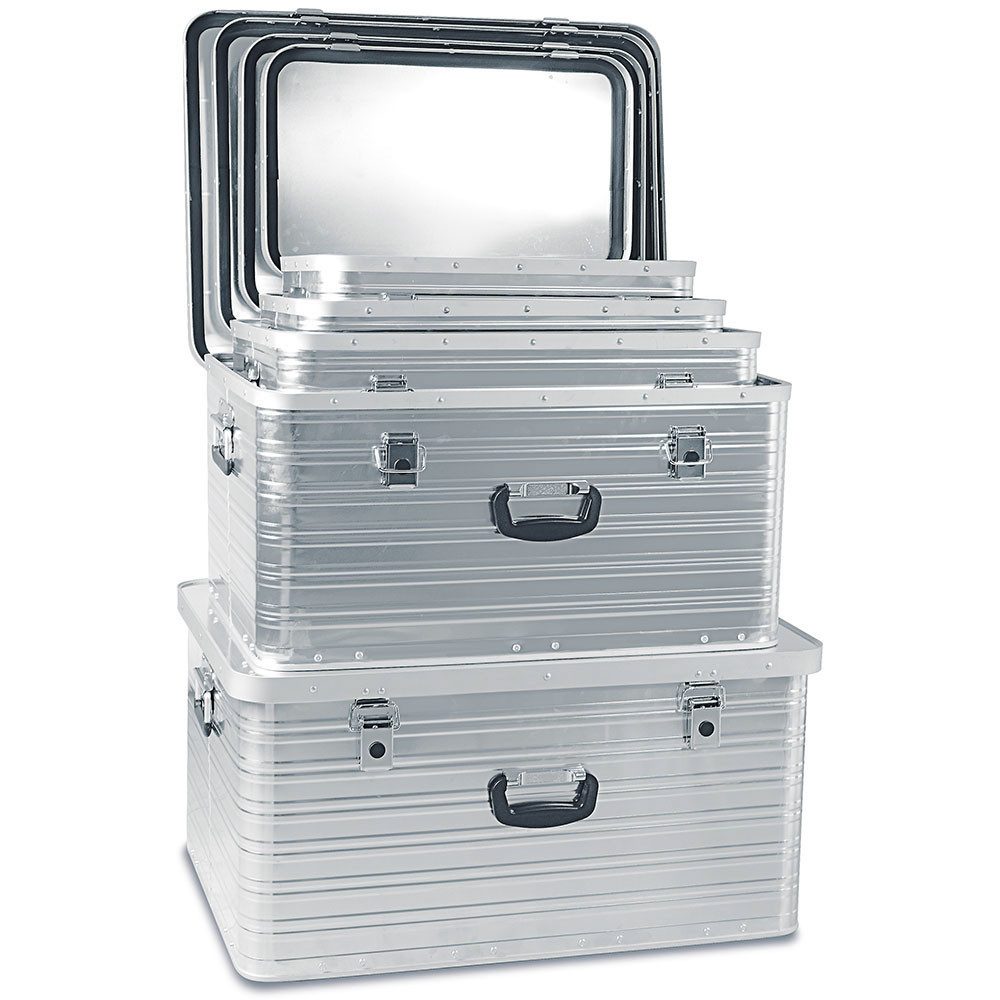 Hochwertige, massive Alu-Behälter für Transport und Lagerung. Die Aluminiumkisten sind sehr stabil, temperatur- und witterungsbeständig. Attraktiv, pflegeleicht und korrosionsbeständig. Deckel mit verstärkten Rändern, fest anscharniert und durch Gurtbänder zusätzlich gesichert. Zum Schutz vor Staub und Spritzwasser mit innenliegender Deckel-Dichtung aus sehr haltbarem Zellgummi. Die Hebelspannverschlüsse sind vorbereitet für Einsteck-Zylinderschlösser, Vorhangschlösser und Plomben. Stabile Feder-Fallgriffe mit Kunststoffummantelung. Hochwertige und saubere Verarbeitung. Schutzecken und Umlaufsicken zur Verstärkung, Randschutzprofil am Boden.
