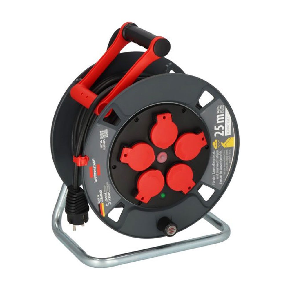 Deine neue Kabeltrommel von Brennenstuhl bietet dir ein sehr robustes 25 m H07RN-F 3G1,5 RN-Kabel, ideal für den Baustelleneinsatz und den dauerhaften Einsatz im Freien. Mit fünf spritzwassergeschützten Schutzkontakt-Steckdosen mit selbstschließenden Deckeln, Überhitzungsschutz und Kontrollleuchte ist sie bestens auf Sicherheit ausgelegt. Der „cablepilot“-Tragegriff sorgt für perfekte Kabelführung beim Auf- und Abrollen. Das Gehäuse aus Spezialkunststoff sitzt auf einem verzinkten Tragegestell, dazu Trommelbremse und Schutzart IP44 - damit bist du auch unter erschwerten Bedingungen safe.