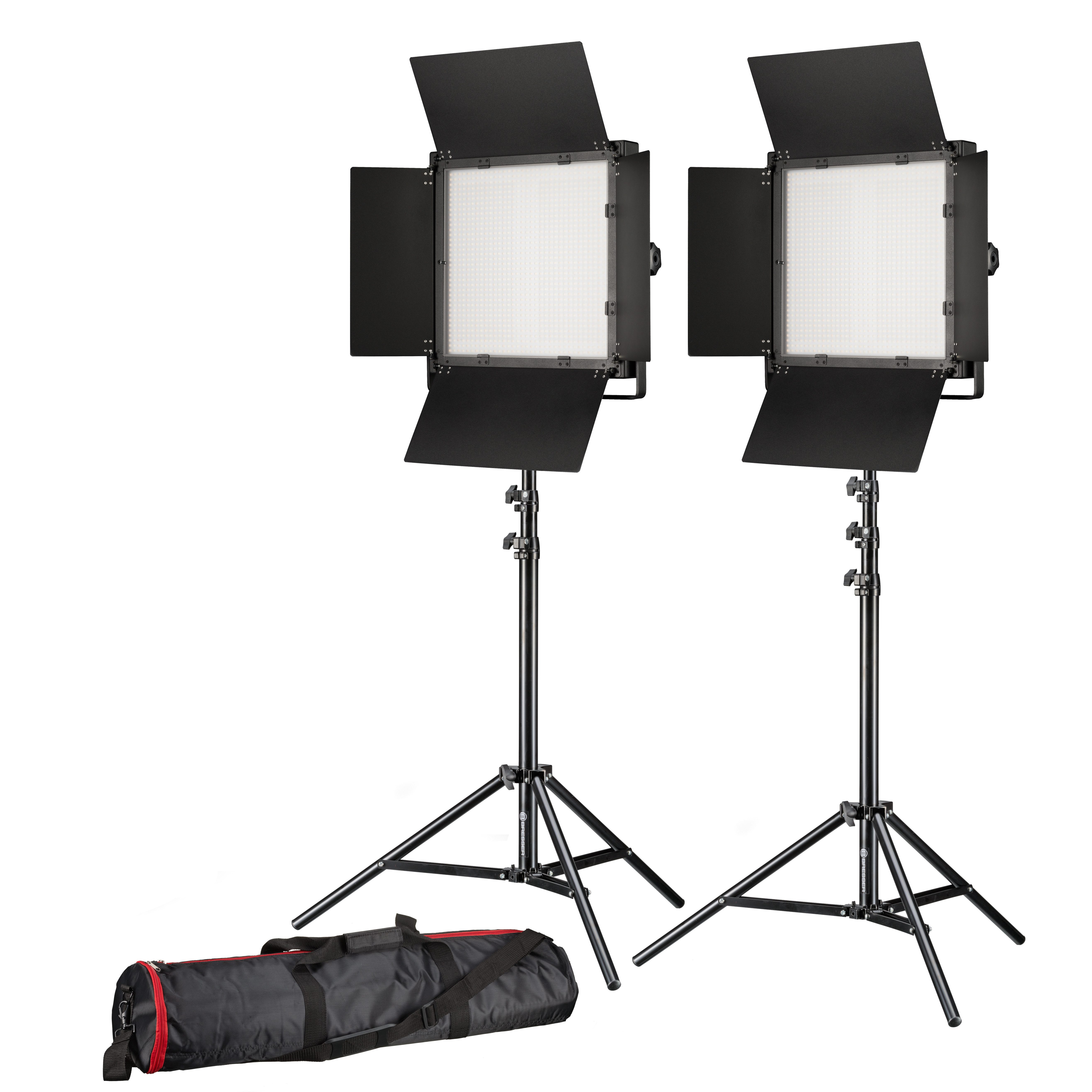 | Lieferumfang | 2x LED Flächenleuchte mit 4 Lichtklappen, 2x Diffusionsfilter 5500 K, 2x Farbfilter 3200 K, 2x Stromkabel, 2x Sicherung, Bedienungsanleitung, 2x Lampenstativ BR-TP240 Pro-1, Stativtasche, 2x Spigotadapter (1/4" männlich, 3/8" männlich) |