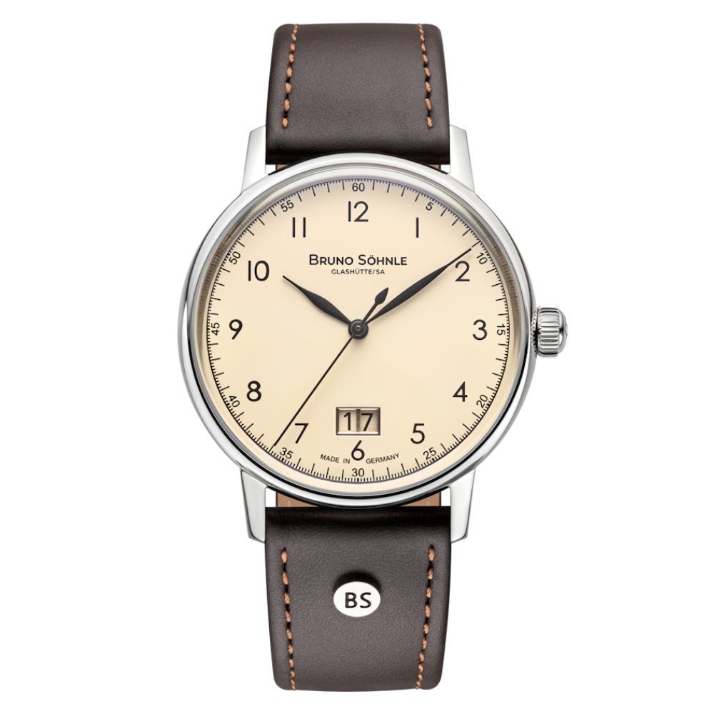 Die BRUNO SÖHNLE Herrenuhr Bergamo Big 17-13234-131 steht für zeitlose Eleganz und deutsche Uhrmacherkunst. Das runde Edelstahlgehäuse (39 mm) wirkt klassisch und trägt sich durch die flache Bauhöhe von 9 mm besonders angenehm. Mit nur 41,6 g ist die Uhr leicht und komfortabel – ideal für den Alltag. Ein Glasboden gewährt zudem einen stilvollen Blick auf das veredelte Uhrwerk. Das cremefarbene Ziffernblatt im Vintage-Stil verleiht der Uhr eine warme, edle Ausstrahlung. Arabische Ziffern, feine Minuterie und schlanke Zeiger sorgen für eine ruhige Optik und klare Ablesbarkeit. Das dezente Datumsfenster bei 6 Uhr rundet die Funktion ab. Auf Leuchtzeiger wurde bewusst verzichtet, um das minimalistische Design konsequent zu halten. Im Inneren arbeitet ein veredeltes BS-Quarzwerk auf Basis des Ronda 6003.B – präzise, zuverlässig und wartungsarm. Geschützt wird das Ziffernblatt durch gewölbtes, innen entspiegeltes Saphirglas, das kratzfest ist und Reflexionen reduziert. 5 bar Wasserdichtigkeit bieten Schutz im Alltag. Das dunkelbraune, glatte Rindlederband mit Dornschließe (20 mm Anstoß) sorgt für einen klassischen, angenehmen Sitz. Eine elegant zurückhaltende Herrenuhr für stilbewusste Männer.