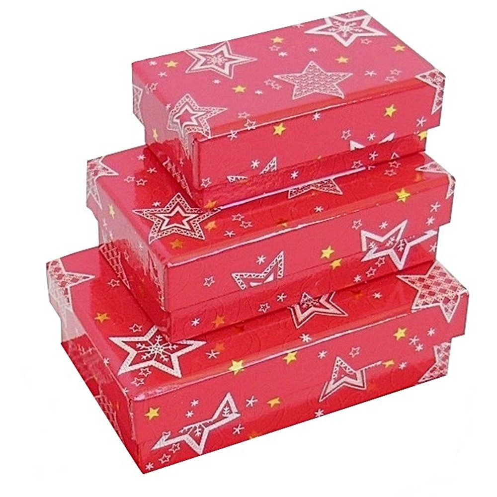 Entdecken Sie dieses Set aus drei hochwertigen Geschenkkartonagen, die nicht nur durch ihre Qualität überzeugen, sondern auch durch ihr außergewöhnliches Design hervorstechen. Jede Kartonage ist sorgfältig mit rotem Lackpapier bezogen, das sowohl große als auch kleine Sterne in Gold und Weiß ziert, ein wahrer Blickfang für jeden Anlass.