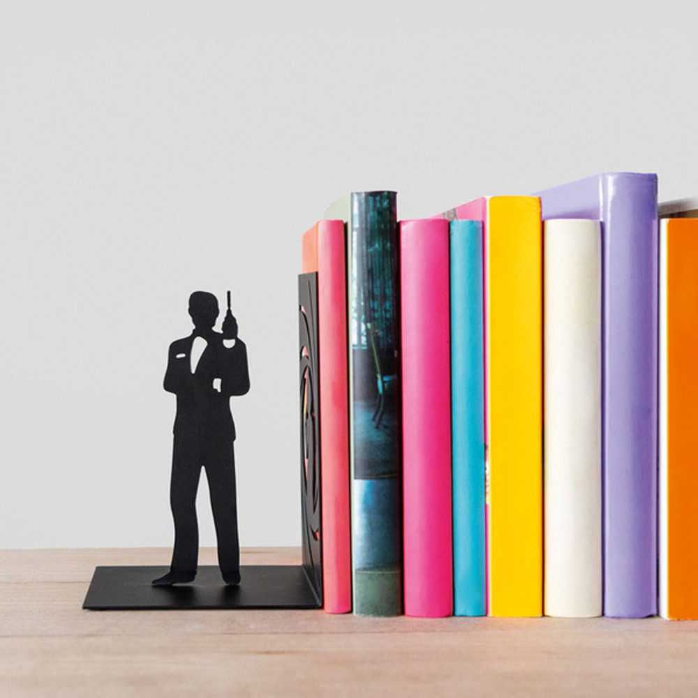 007 beschützt Ihre Bücher! In typischer Pose steht die Silhouette des wohl berühmtesten Geheimagenten der Welt auf der schwarzen Metallplatte. Die stabile, mit Silikonfüßen versehene Buchstütze aus Metall passt also bestens in Ihr Regal mit Krimis, Spionageromanen und Abenteuergeschichten. Und sie schmückt Ihre Büchersammlung zudem sehr besonders. Die Hersteller dieser - und weiterer - Buchstützen lassen sich häufig von großer Literatur inspirieren. Und wer kennt die »James Bond«-Filme bzw. die Bücher von Ian Fleming nicht Wohl kaum jemand hat noch nie von 007 gehört! Der englische Schriftsteller Ian Fleming (1908-1964) hat sich einst diesen heldenhaften James Bond ausgedacht. Der 1. Band - Casino Royale - erschien 1953. »Der Mann mit dem goldenen Colt«, der dieser Buchstütze ja sehr ähnlich sieht, war das letzte James Bond-Buch Flemings und kam 1965, in seinem Todesjahr, auf den Markt. Insgesamt gibt es 12 Romane. Für die Filme aber werden seit Flemings Tod eigens Drehbücher für den Geheimagenten geschrieben.