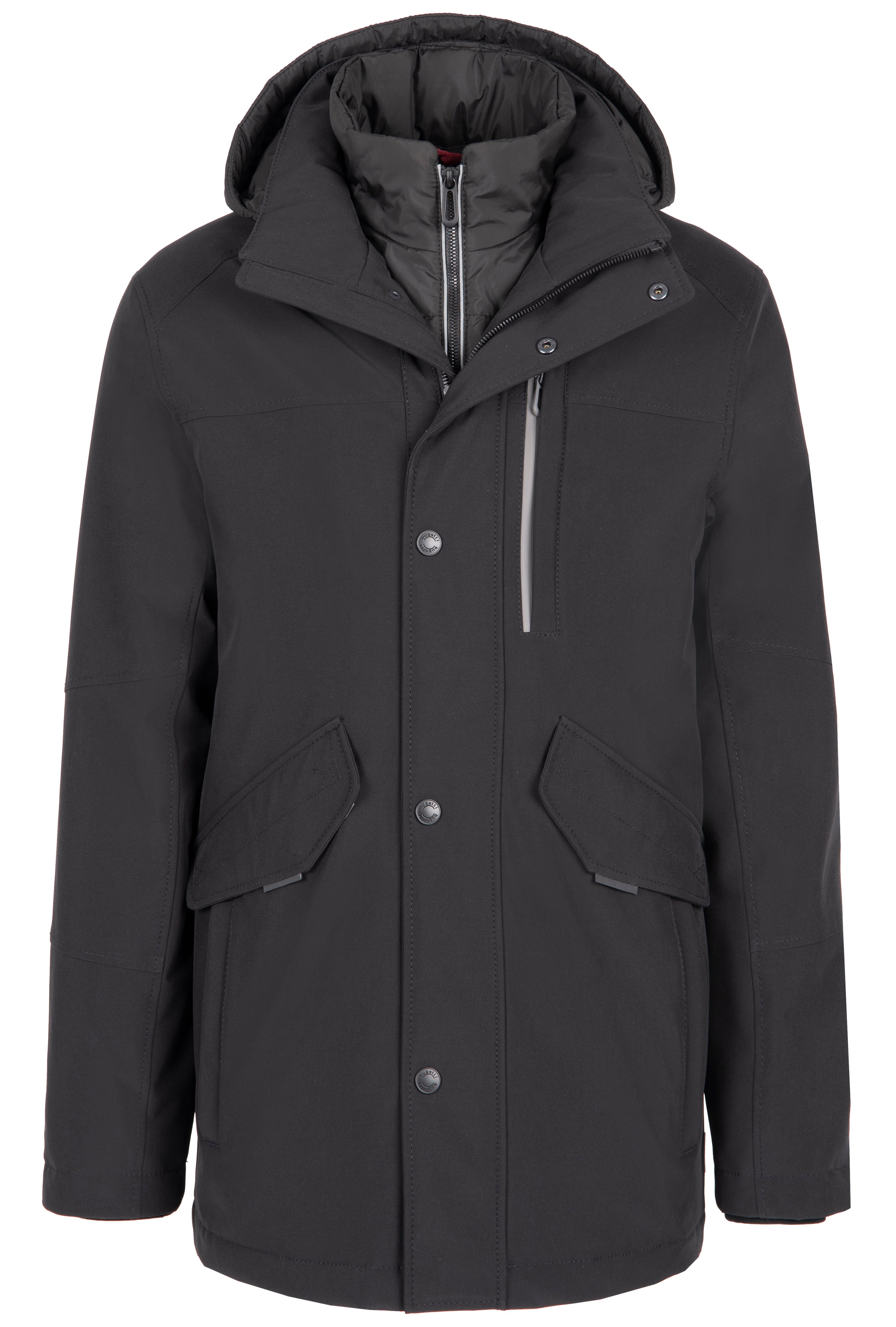 Jacke mit Stehkragen, heraustrennbarer Kapuze, heraustrennbarem Westeneinsatz, reflektierende Elemente an den Außentaschen und dem Kanten-Reißverschluss des Westeneinsatz, verdeckte Strickbündchen am Ärmelsaum, Zwei seitlichen Pattentaschen, zwei seitlichen Reißverschluss-Taschen und einer Reißverschluss-Brusttasche. Das Steppfutter hat im Rückenteil elastische Einsätze und zwei Innentaschen.