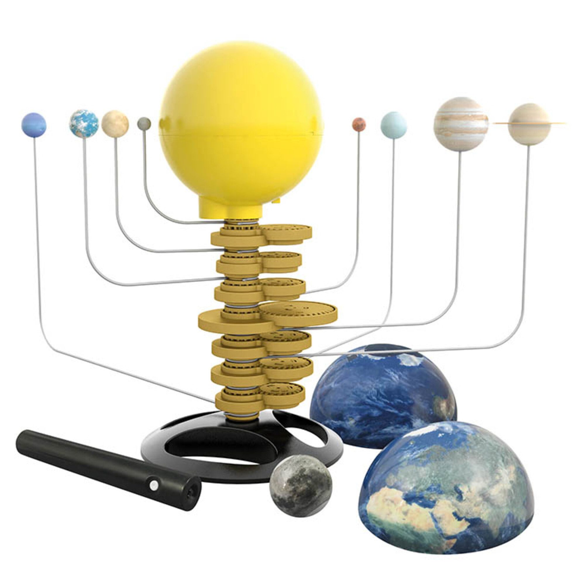 Durch die richtige Wahl der Zahnräder wird die unterschiedliche Umlaufdauer der Planeten wiedergegeben. Ein kompletter Zyklus dauert 35 Minuten. Die Sonne beleuchtet die Szenerie dank einer integrierten Beleuchtung. So dient dieses Modell auch als stimmungsvolle Beleuchtung oder Nachtlampe für Kinder.