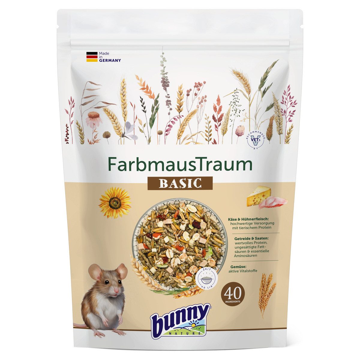 | Zusammensetzung | Zusammensetzung Hafer, Gerstenflocken, Plata Hirse, Erbsenflocken, Gerste, Weizenkleie, Weizenflocken, Sonnenblumenextraktionsschrot, Weizen, Mais, Mais gebrochen, Silberhirse, Hanfsaat, Luzernegrünmehl, Rote Hirse, Sonnenblumensaat, Calciumcarbonat, Paprika (1%), Karotten (1%), Mariendistelsaat, Buchweizen, Kardisaat, Kanariensaat, Biertreber, Grassaat, Leinsaat, Karottentrester, Bierhefe inaktiviert, Luzerneklee, Spitzwegerichblätter, Sesamsaat, Hühnerfleisch getrocknet (0,5%), Käse getrocknet (0,5%), Chicorée Inulin, Haferkerne, Apfel, Rote Bete, Kamillenblüten, Kartoffeleiweiß, Johannisbrot (Getreide 56%, Saaten 20%, Gemüse 10%). Analytische Bestandteile Rohprotein 14,1%, Rohfett 5%, Rohfaser 7%, Rohasche 5%, Kalzium 0,6%, Phosphor 0,4%. |