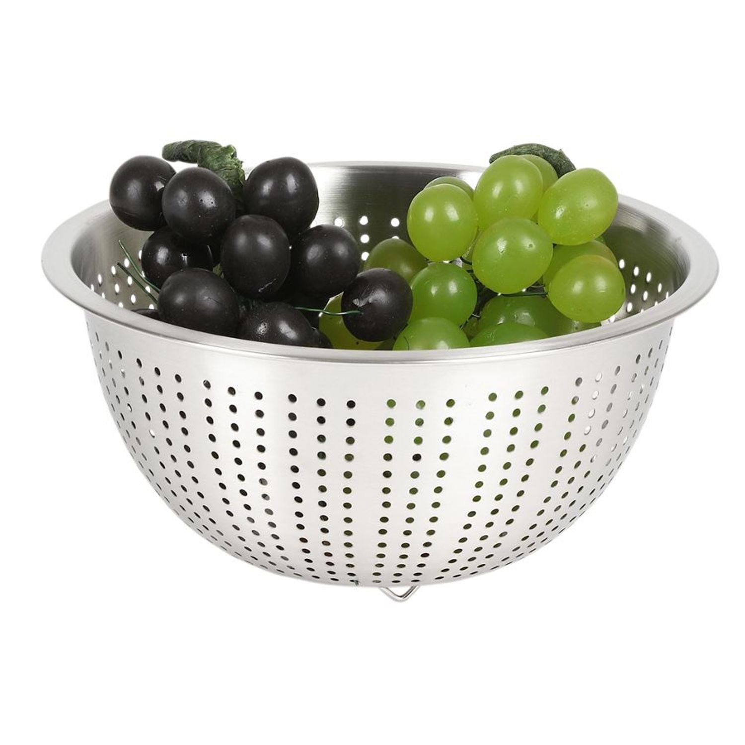 Goßer und praktischer Durchschlag aus rostfreiem Edelstahl mit stabilem Standfuß zum Abwaschen von Obst und Gemüse oder zum Abgießen von Nudeln und Kartoffeln.
