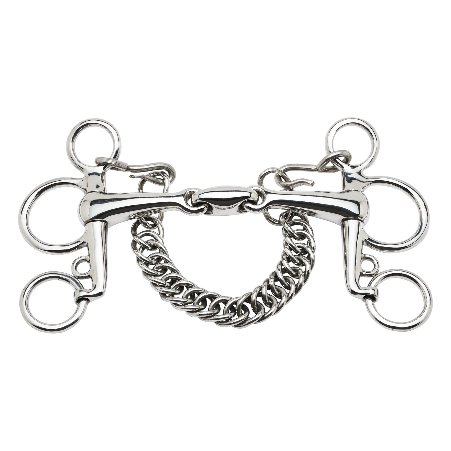 Das Busse doppelt gebrochene Pelham-Gebiss aus Edelstahl ist ideal für präzise Ausbildung und Korrektur. Durch die Konstruktion verwandelt sich das Gebiss bei starkem Druck zur Stange, was eine intensivere Einwirkung ermöglicht. Es liegt ruhig im Maul und bietet durch die kurzen Unterzüge schnelle Druckeinwirkung und -auflösung. Die mittlere Hebelwirkung auf Zunge, Lade und Genick wird durch die spezielle Anordnung der Ringe erzielt. Das Backenstück ist im oberen kleinen Ring positioniert, während der Pelhamstrap im unteren kleinen und großen Ring verschnallt wird. Die gezielte Hilfenverstärkung wird durch das Einsetzen der Hebelwirkung auf Zunge, Lade und Genick erreicht, wobei der untere Zügel im großen und kleinen unteren Ring aufgenommen wird.