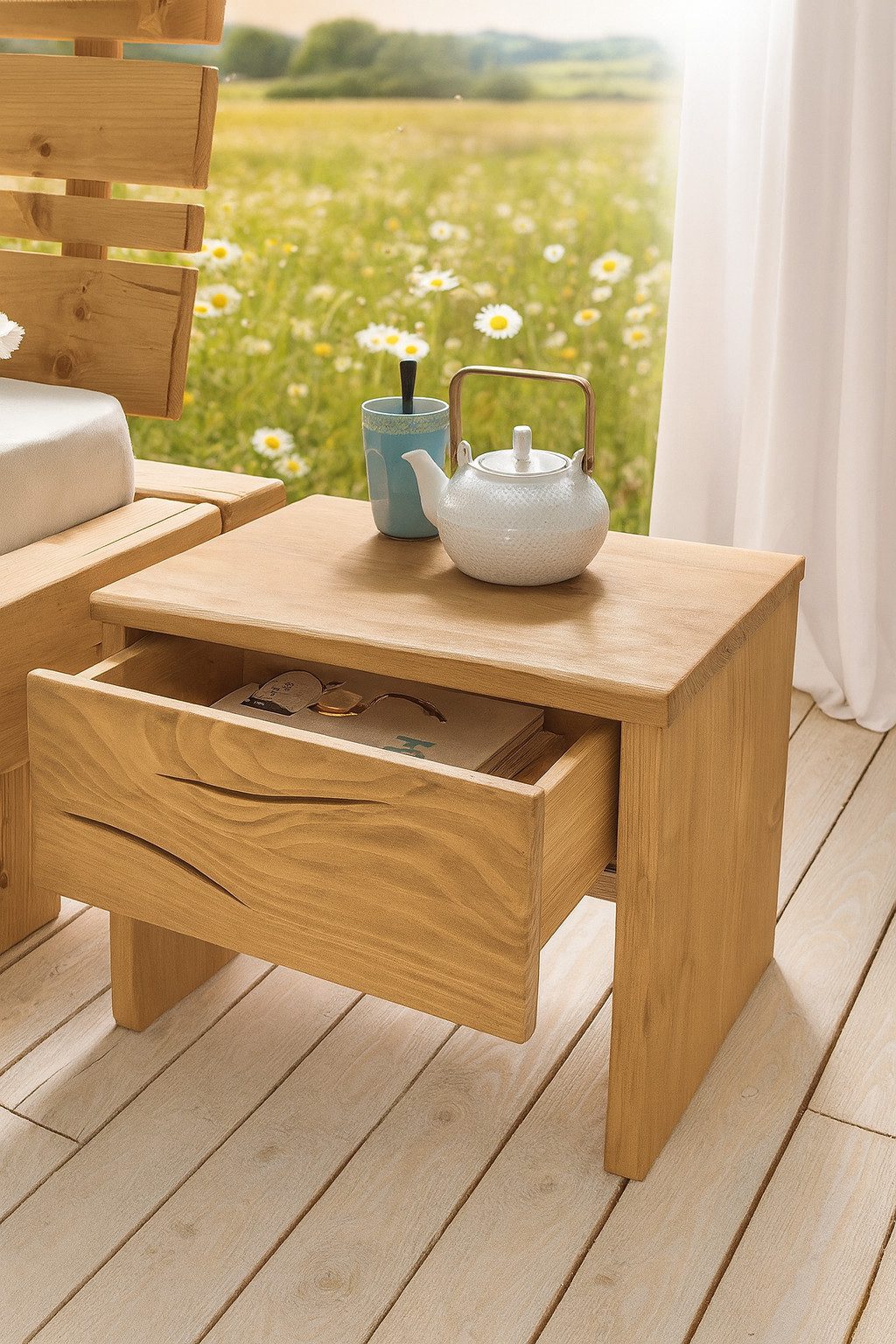 Diese hochwertige Nachtkommode aus massiver, geölter Fichte bringt natürliche Wärme und rustikalen Charme in jedes Schlafzimmer. Die markanten Wuchsrisse und Farbschmückungen sind typische Merkmale des Holzes und unterstreichen die authentische Optik – sie stellen keinen Reklamationsgrund dar, sondern machen jedes Möbelstück zu einem echten Unikat.