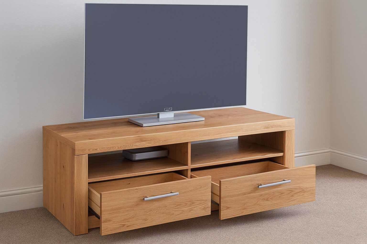 Dieses hochwertige TV-Lowboard in moderner Wildeiche-Optik überzeugt durch sein zeitloses Design, die robuste Verarbeitung und den durchdachten Stauraum. Mit zwei offenen Fächern und zwei geräumigen Schubkästen bietet der TV-Schrank ideale Voraussetzungen für eine übersichtliche und praktische Organisation sämtlicher Multimedia-Geräte und Zubehör. Die offenen Fächer eignen sich perfekt für Receiver, Spielekonsolen oder Streaming-Hardware, während die Schubkästen auf stabilen Rollschubführungen Staubschutz und schnellen Zugriff für DVDs, Fernbedienungen oder technisches Equipment gewährleisten.