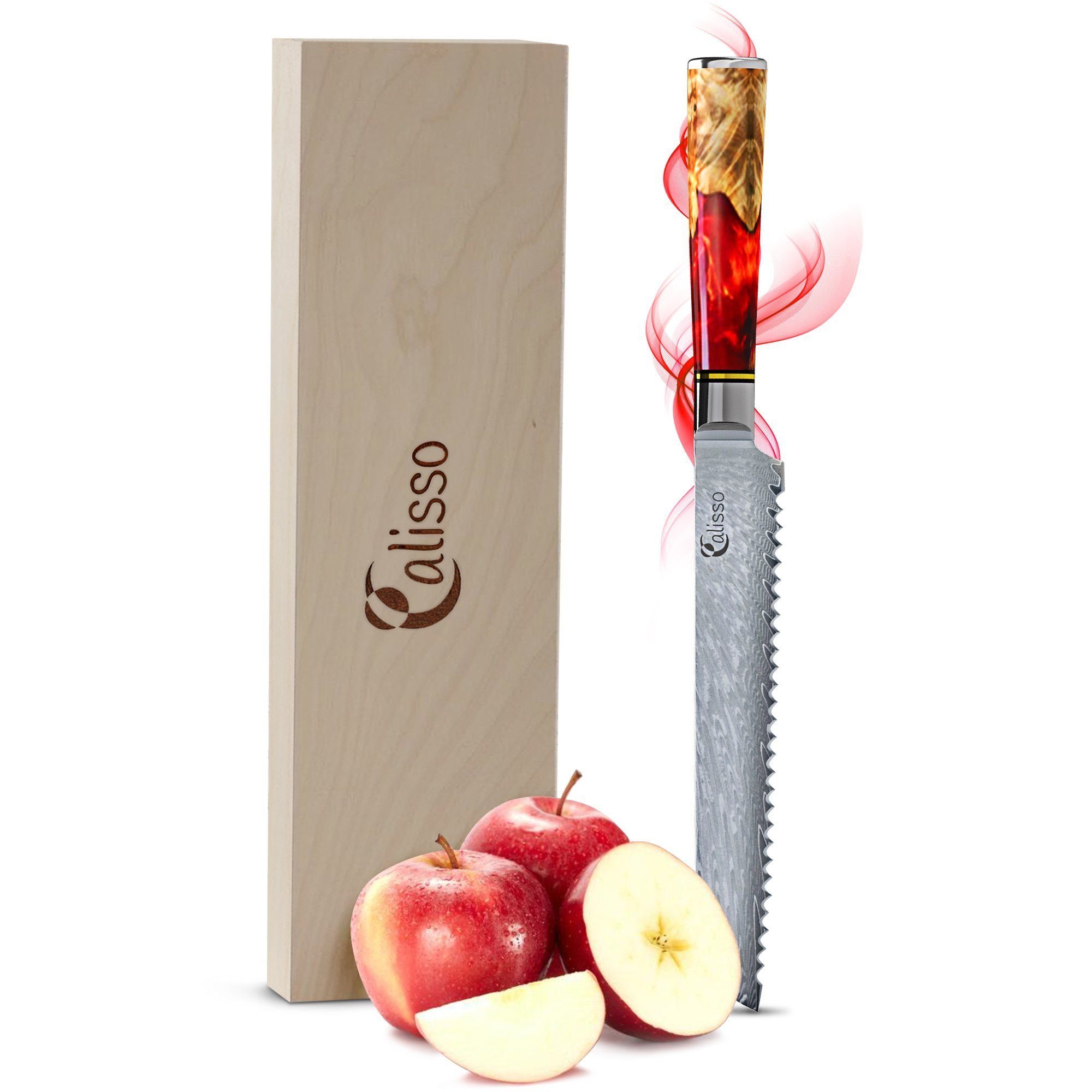 Das Brotmesser mit Wellenschliff ist eine deutsche Erfindung und ist heute weltweiter Standard. Die spitzen Zähne der Klinge reißen zunächst die harte Brotkruste auf, wodurch das Brot einfacher in Scheiben geschnitten werden kann. Außerdem bleibt die eigentliche Klinge scharf, da die spitzen Zähne den Erstkontakt mit dem Brot aufnehmen. Mit dem Brotmesser lassen sich aber auch andere Nahrungsmittel problemlos zerteilen, wie Melone oder Kürbis. Produktdetails Unsere Damastmesser bestehen aus verschieden harten Lagen Stahl und Eisen, welche zu 67 Schichten zusammengeschmiedet wurden. Dadurch sind unsere Damastmesser äußerst flexibel, stabil und können besonders scharf geschliffen werden und bleiben lange scharf. Material Klinge: 67 Lagen Damaskus Stahl, bestehend aus 66 Lagen 10Cr15CoMoV und 1 VG-10 Damaskus Stahlkern Material Griff: gefärbtes Harz, streng ausgewähltes Hartholz Härtegrad: 60 ± 2 HRC Unglaubliche Schärfe durch Schleifwinkel von 15° Der verwendete Stahl und eine gründliche Politur jeder Klinge führen zu guter Rostbeständigkeit. Der Griff ist in rubinrot angefertigt und für ausgezeichnete Kontrolle, Agilität und Komfort beim Schneiden entwickelt. Damit liegt das Messer auch über längere Arbeitsphasen in der Küche gut in der Hand. Achtung: Das Messer ist nicht zum Zerhacken von Knochen geeignet! Dimensionen Grifflänge: 135 mm Klingenlänge: 188 mm Messerlänge: 323 mm Höhe: 31 mm Breite: 1,8 mm Gewicht: 175 g Pflegehinweise Ein gutes Küchenmesser aus Damaskus-Stahl sollte gut gepflegt werden. Lesen Sie sich dafür gerne unsere Hinweise online unter https://calisso.de/pages/pflegehinweise durch.