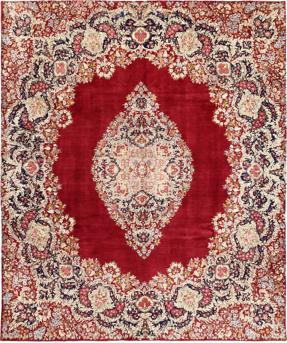 Die Farb- und Färbefähigkeiten der Region waren beispiellos und die Färber von Kerman wurden berühmt für die Herstellung von zarten und subtilen, hellen Farbtönen, die man anderswo nicht findet. Kerman-Teppiche zeichnen sich durch ihre typische rote Grundfarbe aus, einem reichen, traditionell roten oder blauen Hintergrund, der wunderschön mit helleren und komplizierteren floralen, vasenartigen und krummlinigen Mustern verziert ist.