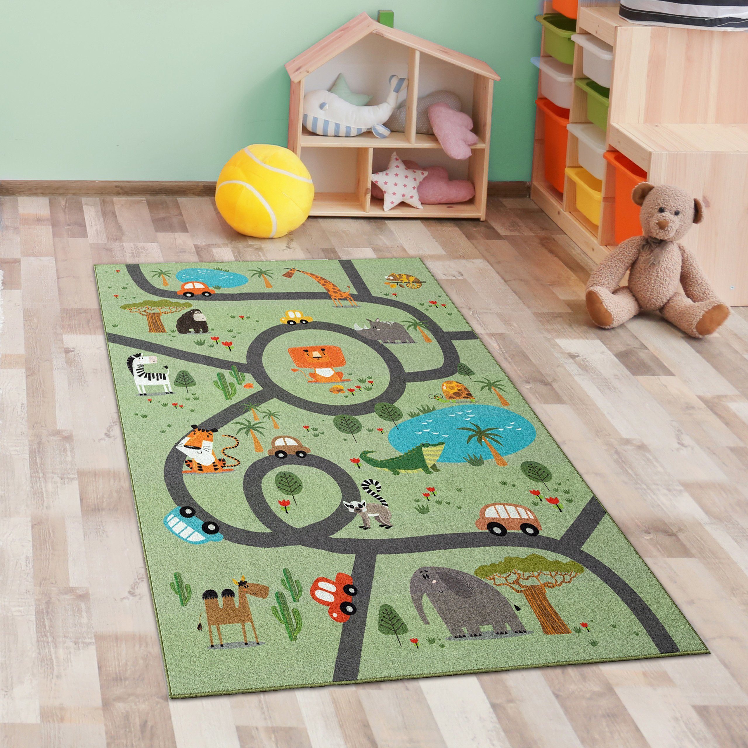 Begib dich auf eine aufregende Safari-Expedition mit unserem hochwertigen hellgrünen Kinderteppich im Safari-Motiv! Dieser zauberhafte Teppich verwandelt jedes Kinderzimmer in einen atemberaubenden Dschungel, in dem junge Entdecker die faszinierende Tierwelt hautnah erleben können. In diesem lebhaften Dschungel tummeln sich majestätische Löwen, beeindruckende Elefanten, elegante Zebras und mutige Krokodile auf einem grünen Hintergrund und laden zu unvergesslichen Abenteuern ein.