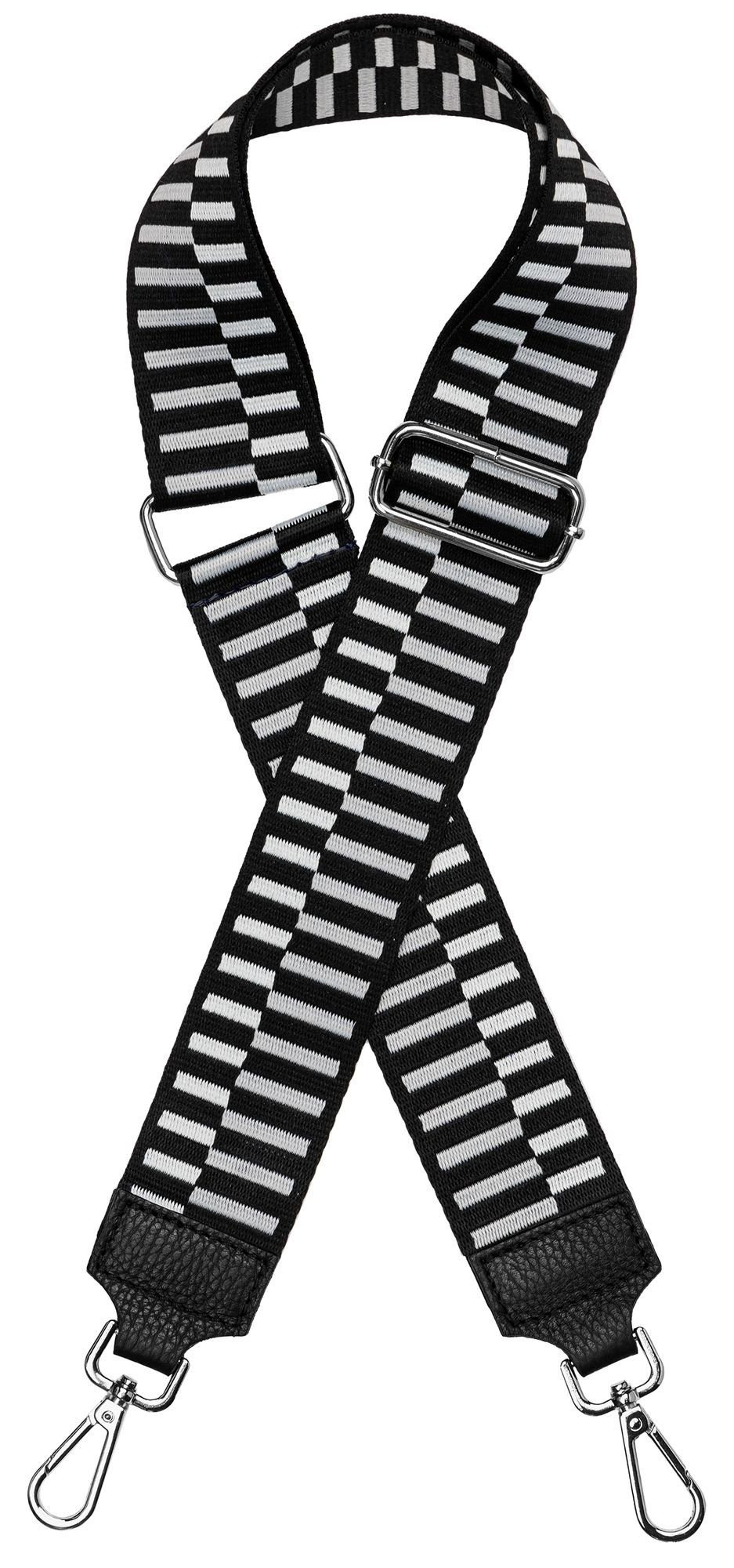 Hochwertiger, breiter Zusatz Tragegurt für Handtaschen aus reißfestem Textilgewebe und echtem Leder. Der 5 cm breite Umhängegurt hat eine flexibel einstellbare Gesamtlänge von 85 bis 128 cm und ist somit optimal geeignet als einfacher Schultergurt und/oder zum Tragen der Tasche als Cross Body Bag quer über der Schulter. Dank der Breite des Gurtes und dem griffigen Textilband hält der Gurt Deine Tasche perfekt auf der Schulter und verhindert lästiges Abrutschen. Und an sofort kannst Du Deine Lieblingstasche jetzt auch bequem quer über der Schulter tragen! Und mit dem schlichten aber dennoch auffallende Streifenmuster des Gurtes bekommst Du ein neues, dezent modisches Accessoire für Dein stilvolles Outfit. Material: Textilgewebe / Leder. Farbe der Metallteile: silber. Caspar - Made in Italy.