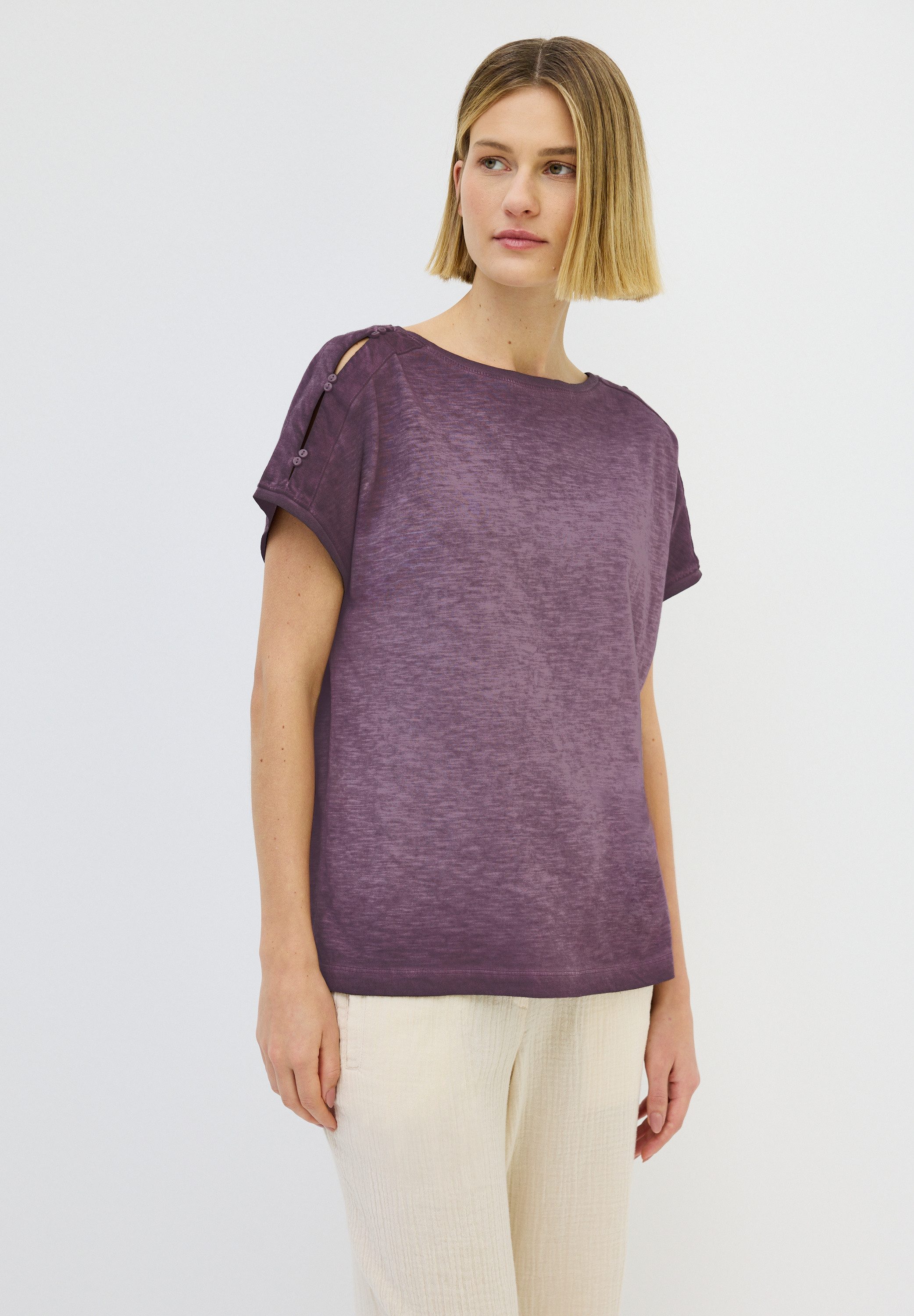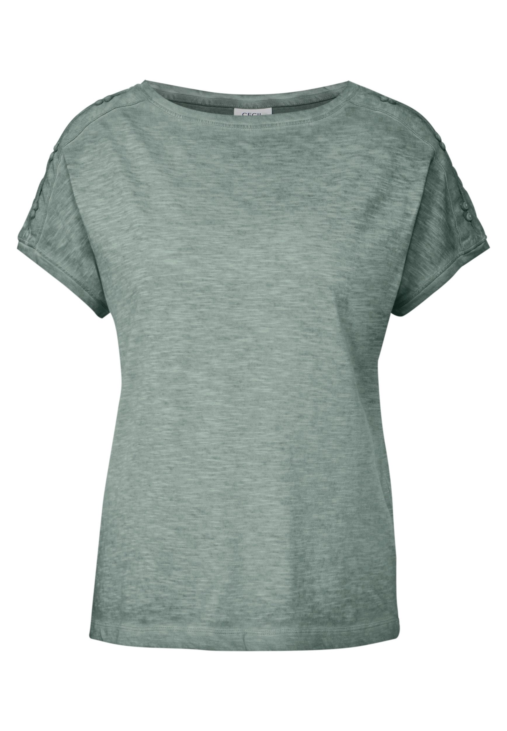 Das T-Shirt von Cecil macht alles möglich — ob dezent, cool oder peppig. Durch die Zierknöpfe wirkt es charmant und stylisch. Dieses Shirt hat einen U-Boot-Ausschnitt und ist hüftlang.